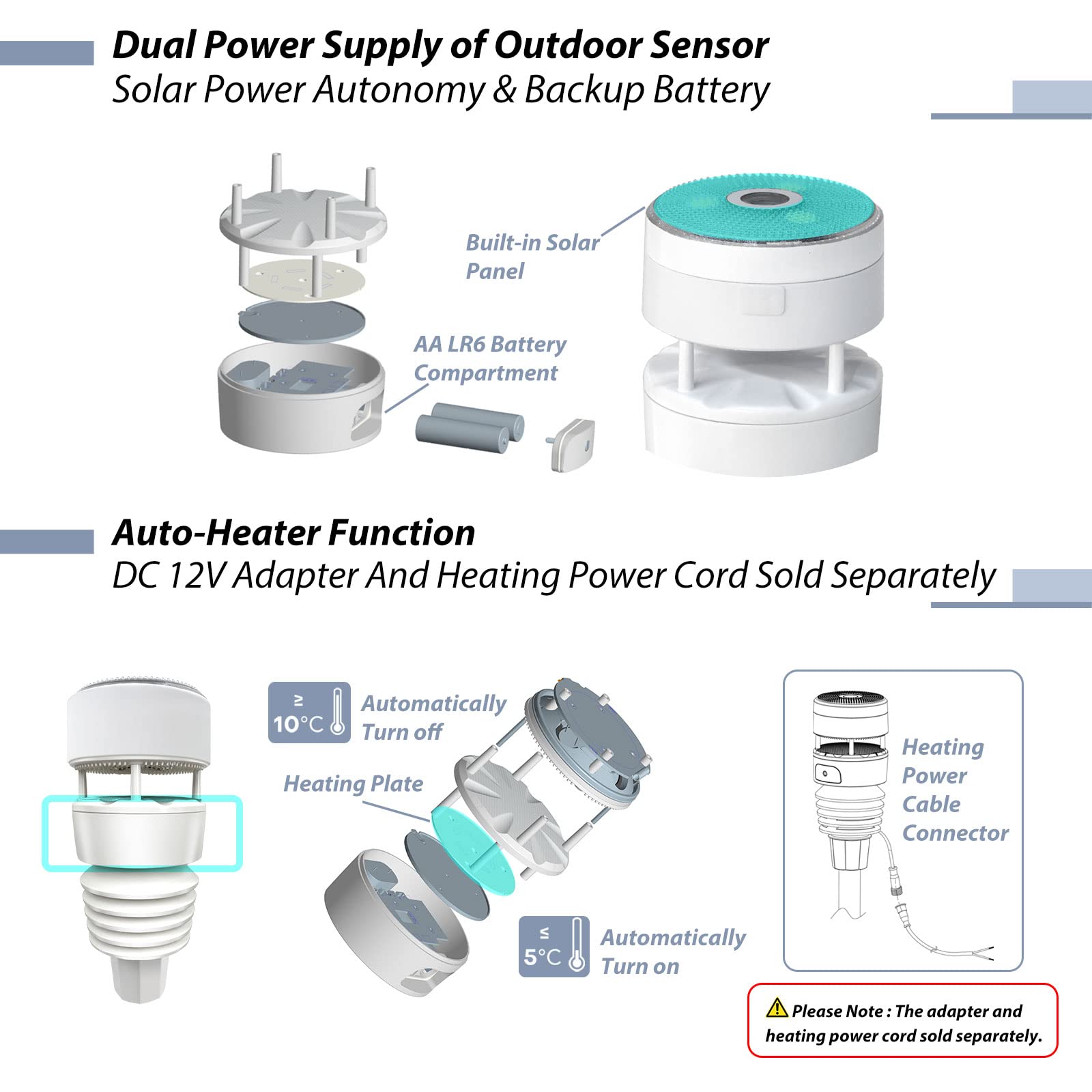 Der WS90 Aussensensor wird primär über ein integriertes Solarpanel mit Energie versorgt. Für den Betrieb in der Nacht oder an bewölkten Tagen verfügt er über einen internen Superkondensator als Energiespeicher sowie ein Batteriefach für eine Backup-Stromversorgung, um eine lückenlose Datenerfassung sicherzustellen.