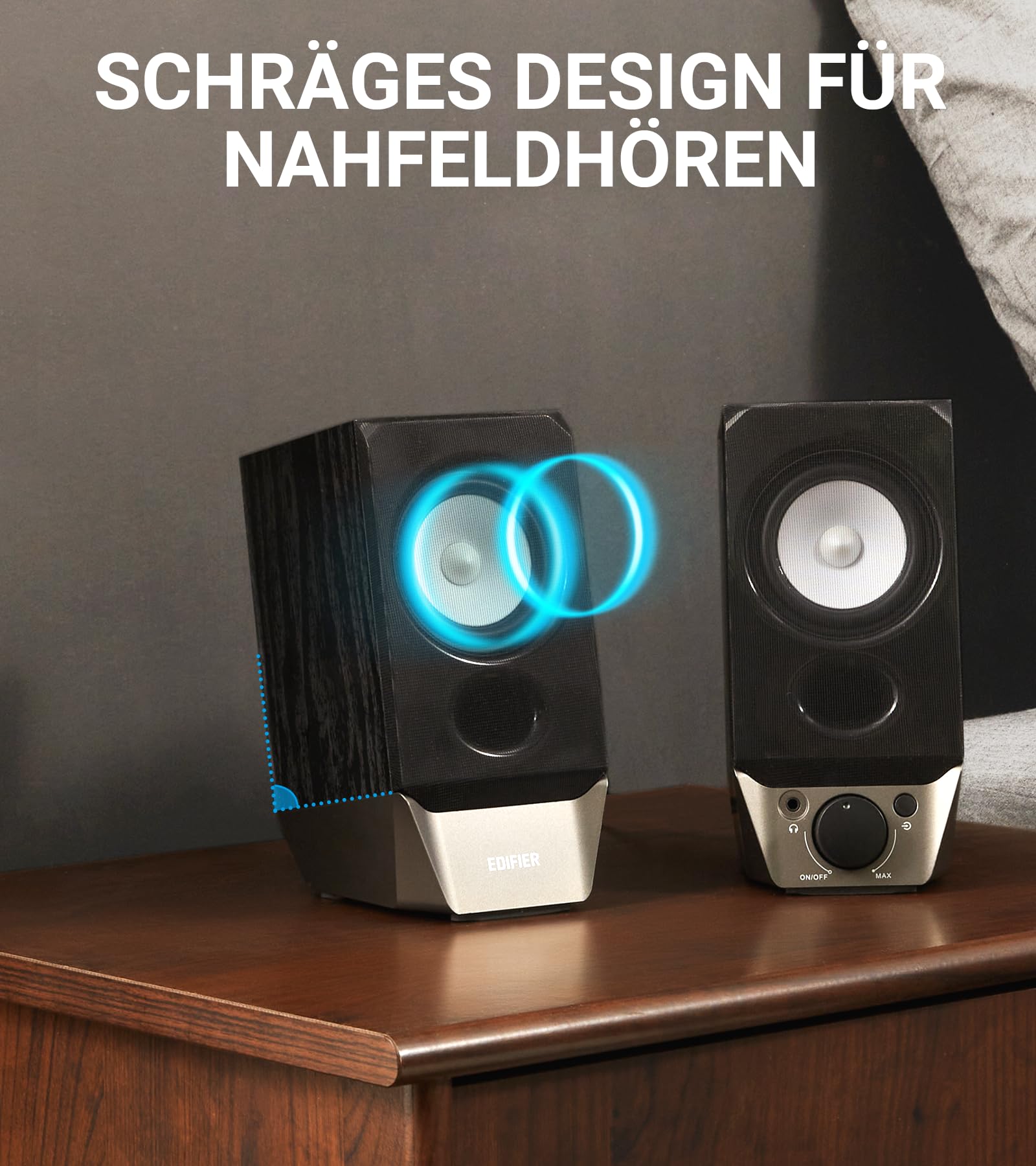 Das R19BT System liefert nicht nur einen beeindruckenden, raumfüllenden Stereoklang, sondern überzeugt auch optisch. Das edle Holzgehäuse wertet jeden Schreibtisch auf, während die Konstruktion für ein ausgewogenes und kraftvolles Hörerlebnis bei Musik, Filmen oder Games sorgt.