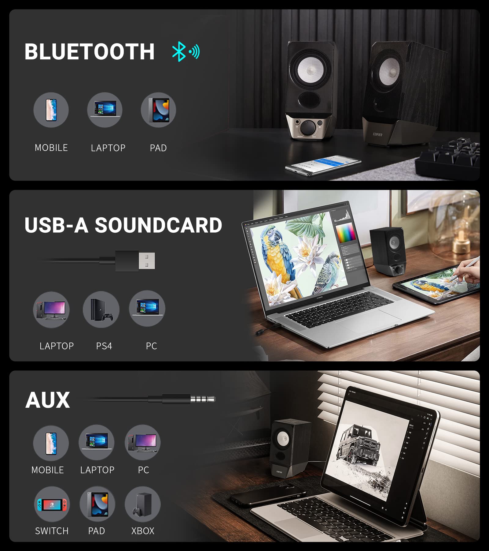 Sie geniessen maximale Flexibilität mit drei Anschlussarten: Verbinden Sie Ihre Geräte kabellos über modernes Bluetooth 5.3, nutzen Sie die integrierte USB-Soundkarte für eine unkomplizierte Ein-Kabel-Verbindung mit Ihrem PC oder Laptop oder verwenden Sie den klassischen 3,5-mm-AUX-Eingang für Fernseher und Mobilgeräte.