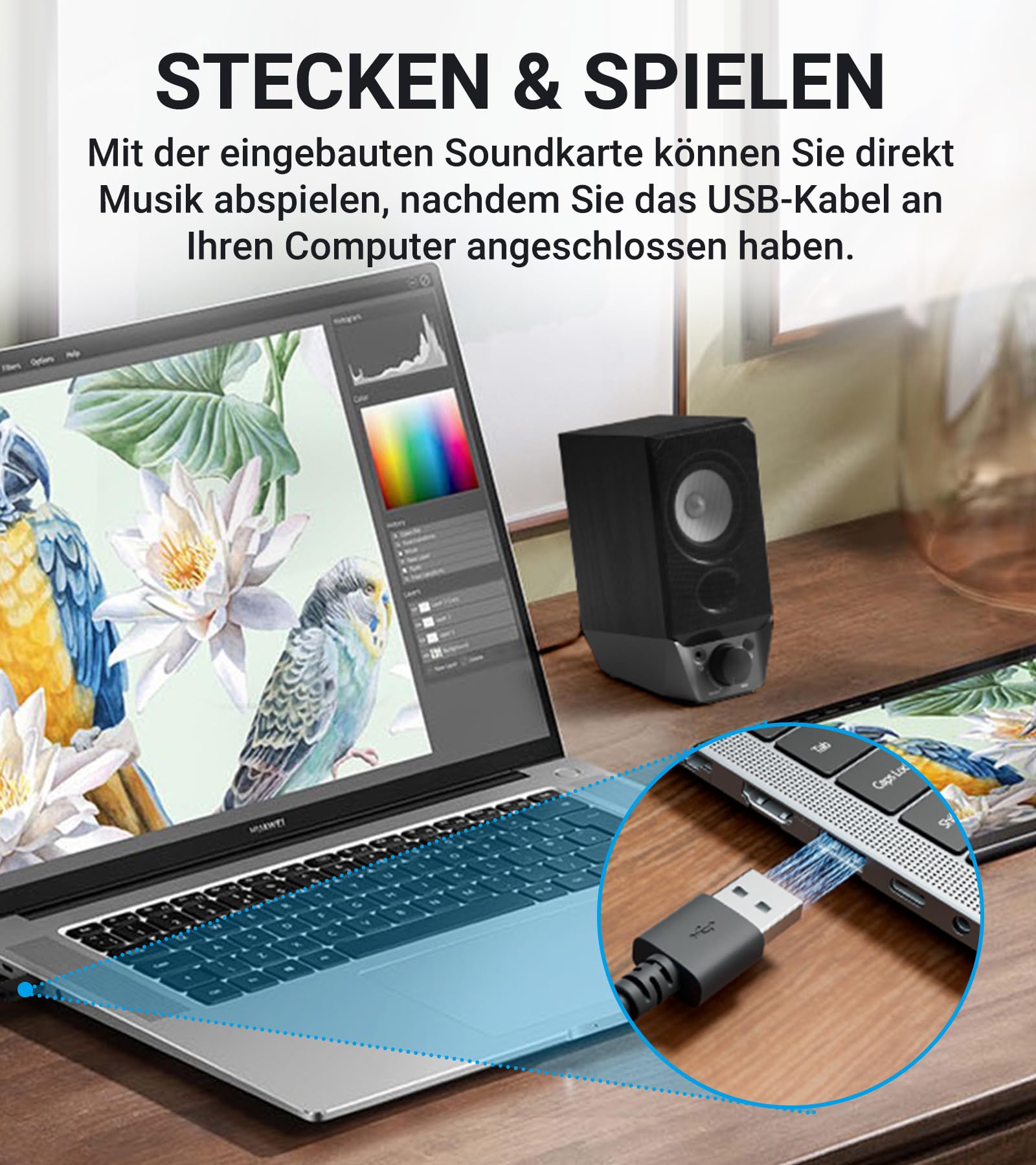 Das stilvolle Gehäuse besteht aus Holz (MDF), was nicht nur für eine edle Optik auf jedem Schreibtisch sorgt, sondern auch die Klangqualität positiv beeinflusst. Beim Kauf erhalten Sie eine zweijährige Herstellergarantie, die Ihnen langanhaltende Zuverlässigkeit und Sicherheit bietet.