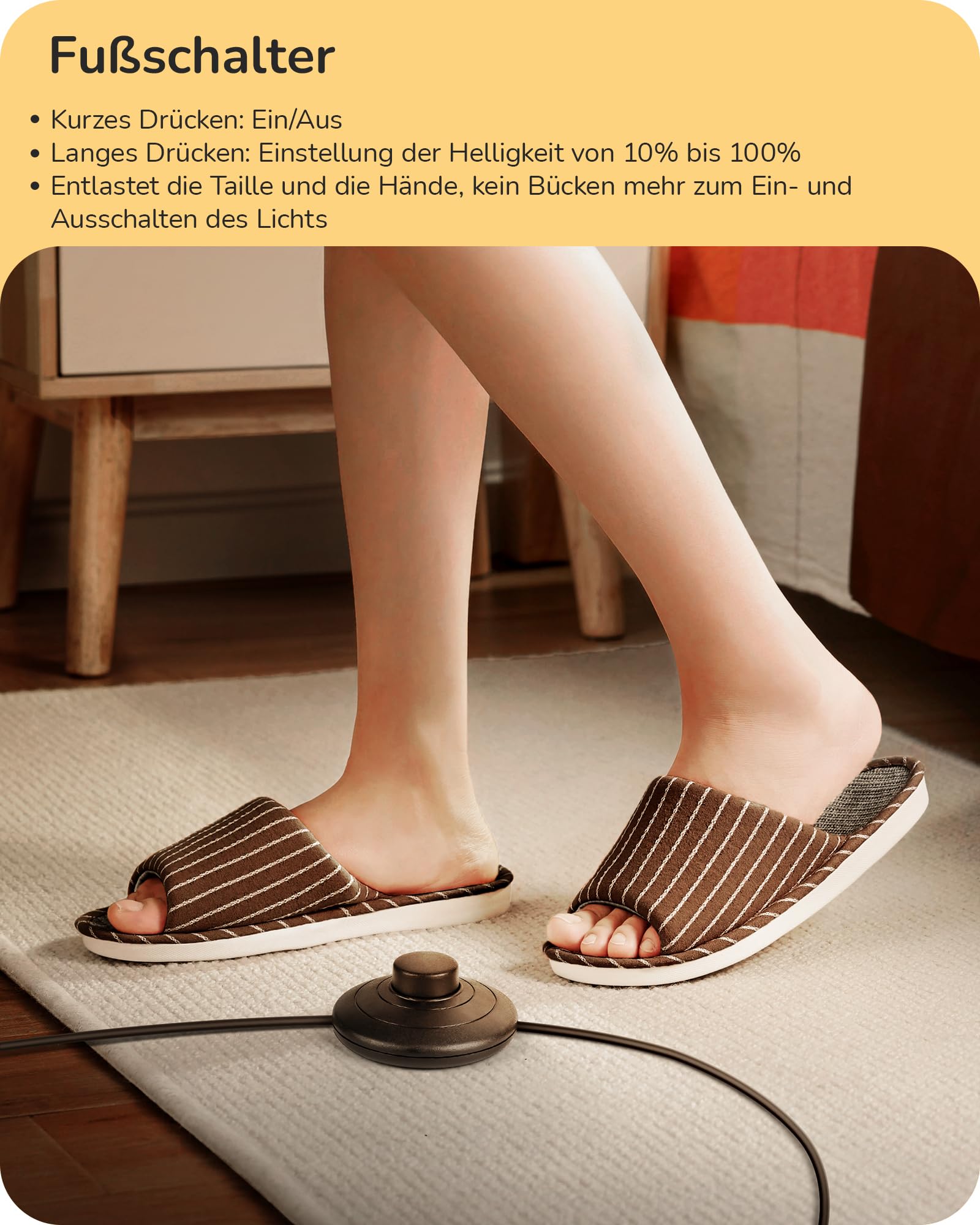 - Stufenlose Dimmung: Ein praktischer Fussschalter ermöglicht das Ein- und Ausschalten (kurzes Drücken) sowie die stufenlose Anpassung der Helligkeit (langes Drücken).