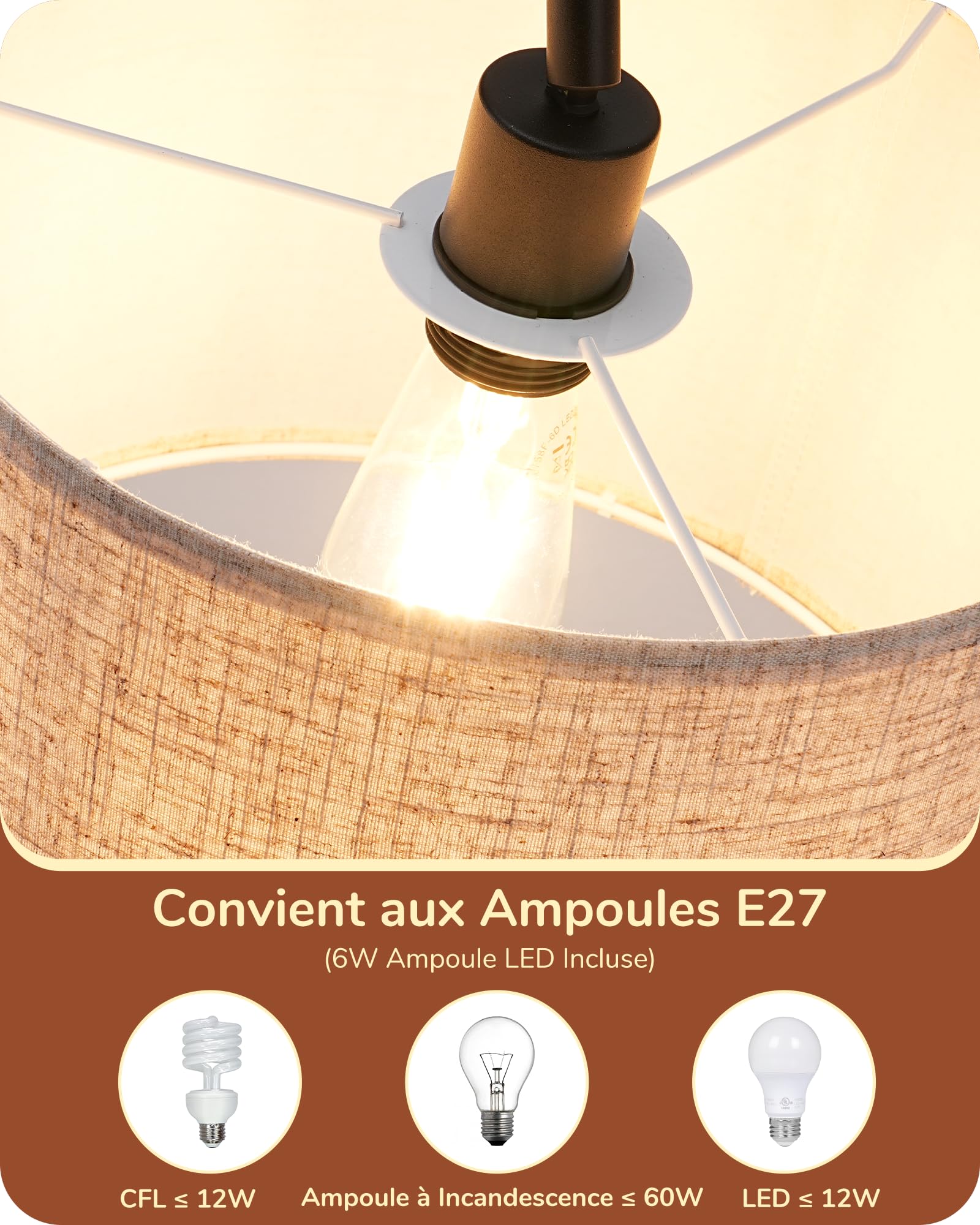 Die Lampe bietet Ihnen zudem volle Flexibilität bei der Wahl des Leuchtmittels. Während eine energieeffiziente LED-Birne bereits mitgeliefert wird, ist der E27-Sockel auch mit anderen Leuchtmitteln bis 60W (Glühlampe) oder 12W (LED) kompatibel. So können Sie die Helligkeit und Lichtfarbe ganz nach Ihren Wünschen anpassen.