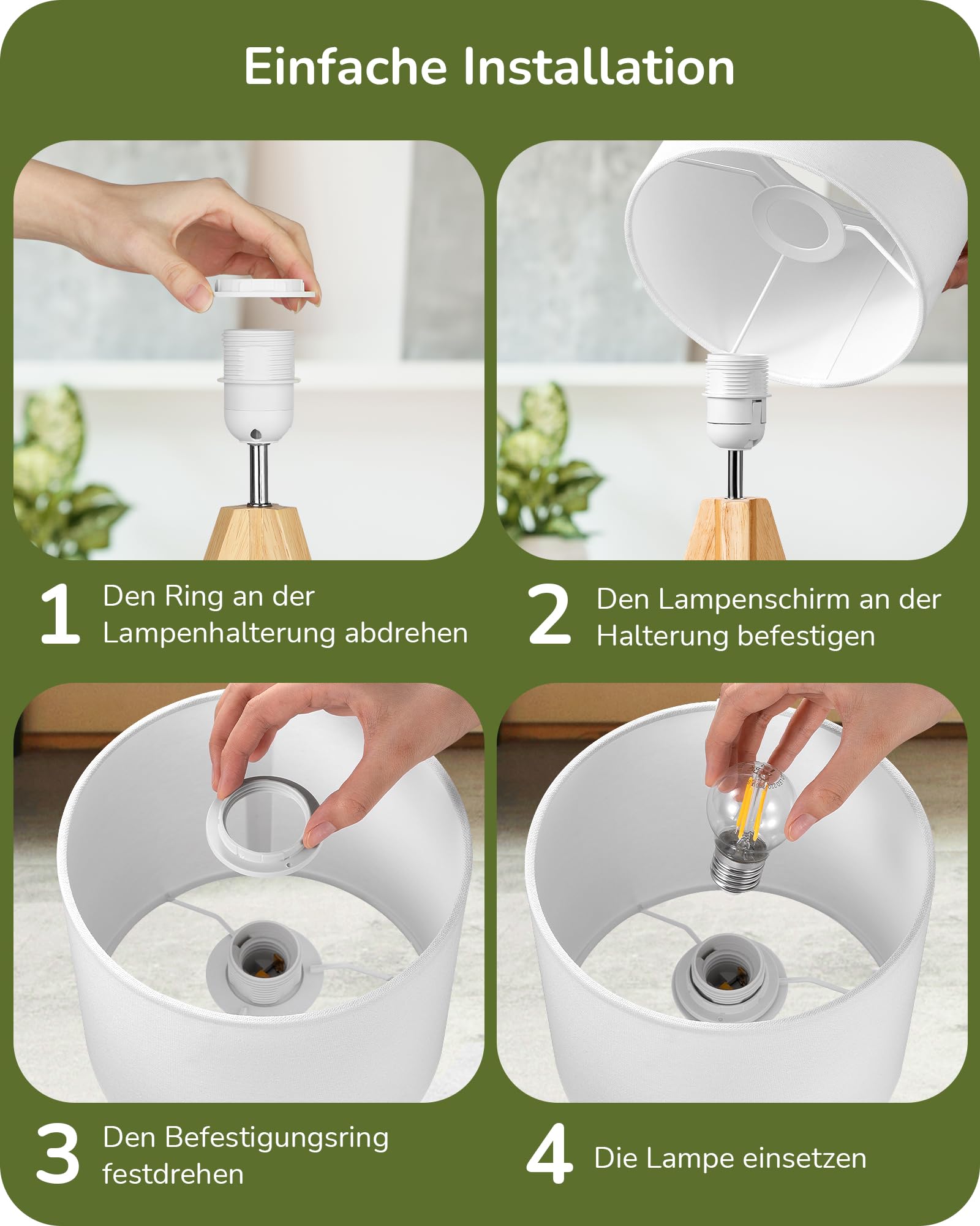 - Lampenschirm aus hochwertigem Leinen: Der Stoff überzeugt mit seiner klaren Textur und natürlichen Haptik. Er ist hitzebeständig, leitet Wärme effizient ab und erzeugt ein weiches, blendfreies Licht, das die Augen schont.