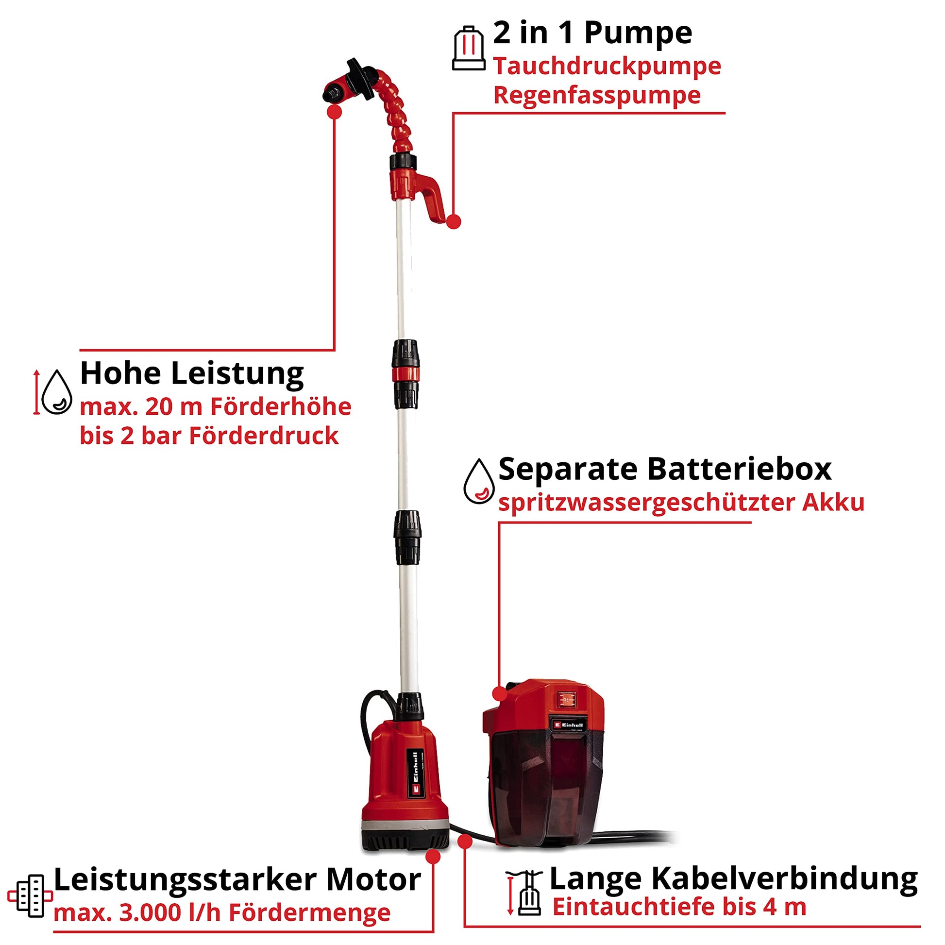 Diese flexible Akku-Pumpe ist die ideale Lösung für die Wasserförderung aus Zisternen, Brunnen oder Regenfässern. Sie vereint die Funktion einer Tauchdruckpumpe und einer Regenfasspumpe in einem einzigen, kabellosen Gerät und wird als Komplettset geliefert.
