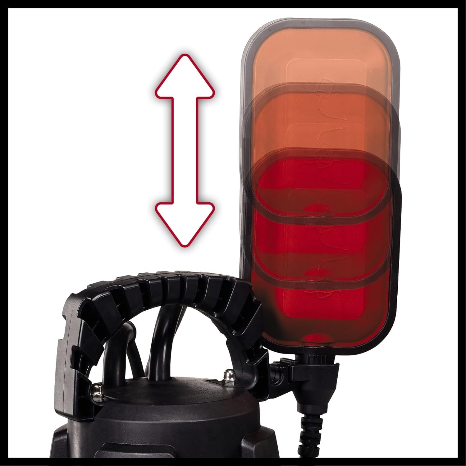 Die Pumpe verfügt über einen stufenlos höhenverstellbaren Schwimmerschalter. Dieser schaltet die Pumpe je nach Wasserstand automatisch ein und wieder aus. Das ermöglicht einen zuverlässigen, unbeaufsichtigten Betrieb und schützt die Pumpe vor dem Trockenlaufen.