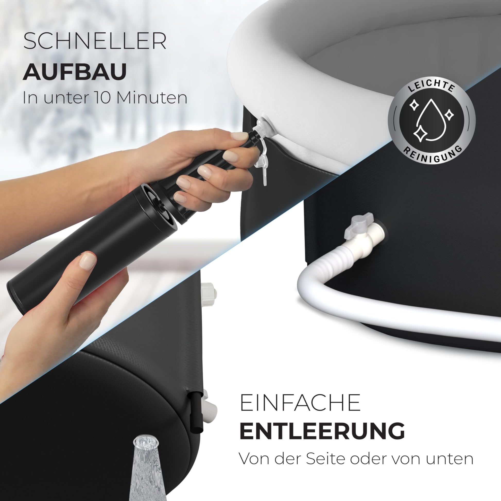 Das Komplettset beinhaltet alles, was Sie für den Start benötigen: das Eisbad selbst, einen isolierenden Thermodeckel, eine wetterfeste Abdeckplane, einen aufblasbaren Komfort-Ring für den Rand sowie einen zweiten Auslass für den optionalen Anschluss eines Kühlgerätes.