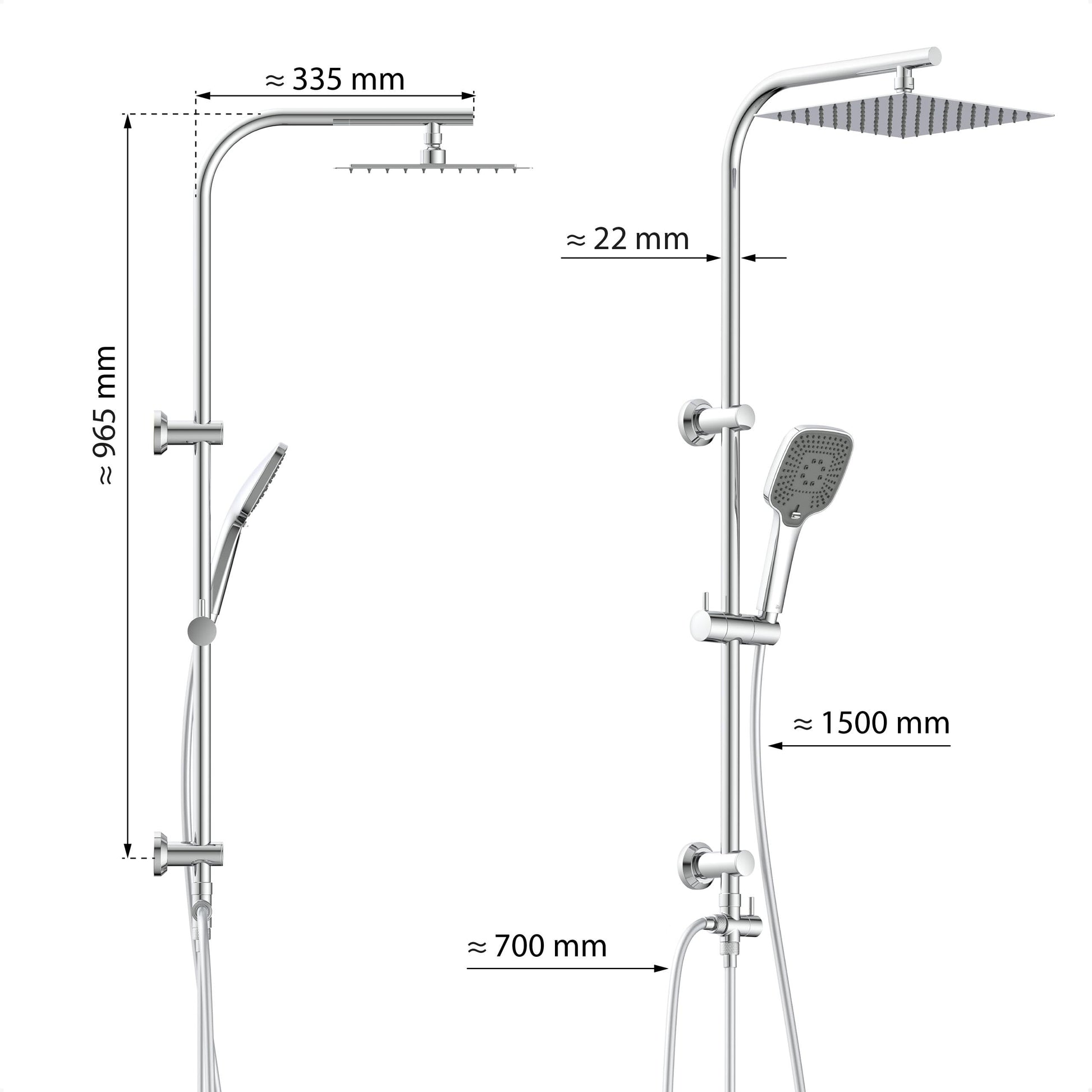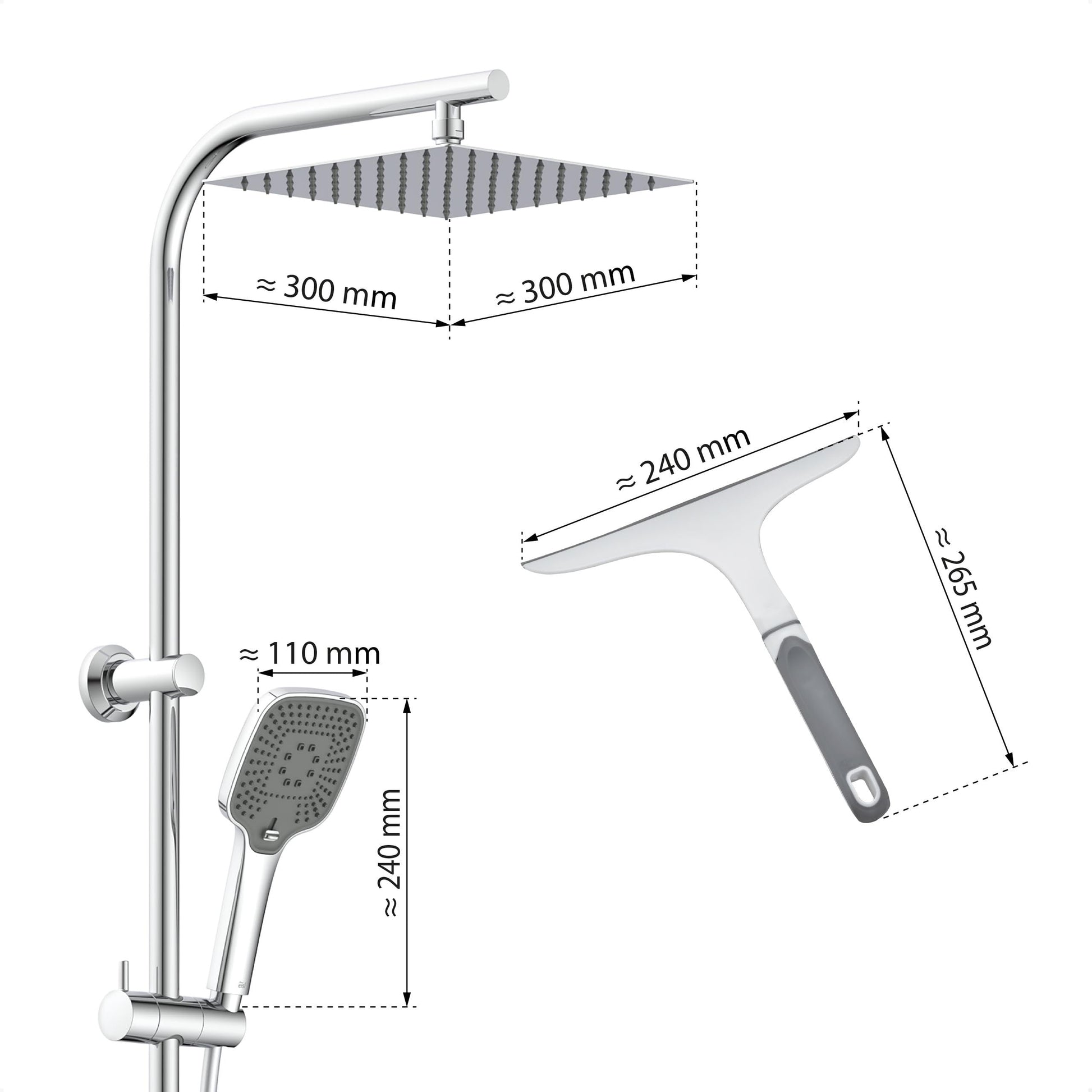Das Komplettset enthält die Duschstange, eine grosse 300x300 mm Edelstahl-Regendusche, eine Handbrause, einen Duschschlauch, den Anschlussschlauch zur Armatur, das komplette Montagematerial sowie einen praktischen 25 cm breiten Duschabzieher für die Glasreinigung.