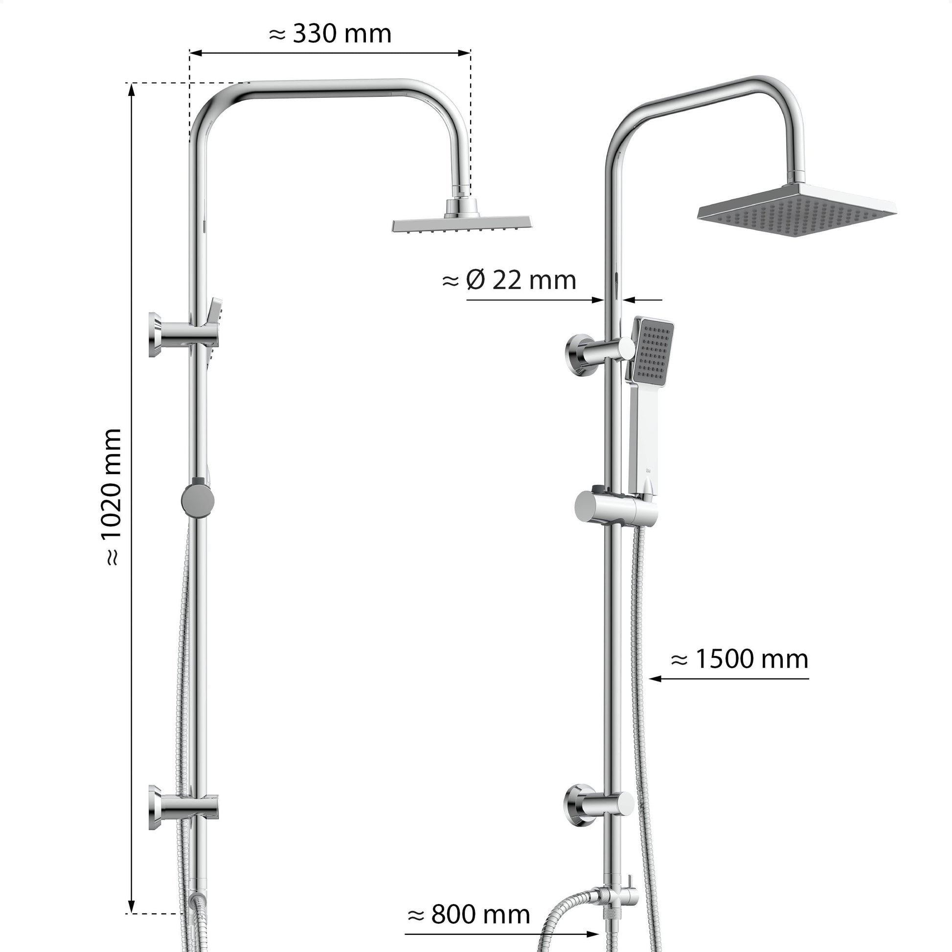 Das Komplettset beinhaltet alles, was Sie für die Nachrüstung benötigen: eine grosse Kopfbrause (176 x 176 mm), eine flexible Handbrause, eine 103 cm lange Duschstange, einen 150 cm langen Brauseschlauch, einen 80 cm langen Anschlussschlauch für Ihre Armatur sowie alle Dichtungen, inklusive Wasserspar-Varianten.