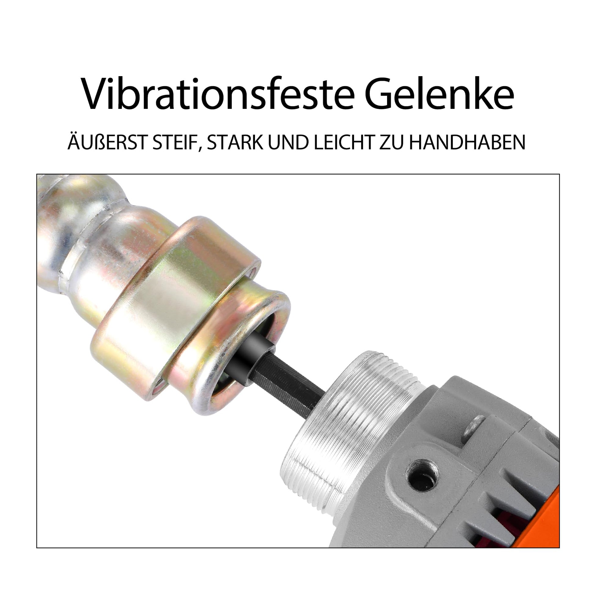 Die Handhabung ist auf maximalen Komfort und Effizienz ausgelegt. Der ergonomische Griff mit rutschfestem Design sorgt für sicheren Halt während der Arbeit. Dank des praktischen Feststellschalters kann der Rüttler im Dauerbetrieb genutzt werden, was die Arbeitsintensität verringert und die Finger entlastet. Die Montage ist denkbar einfach: Der Schaft wird ohne zusätzliches Werkzeug direkt auf die Antriebseinheit geschraubt.