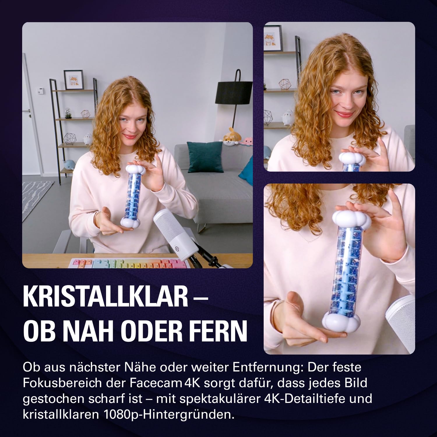 Die Facecam 4K ist mehr als nur eine Webcam – sie ist ein Werkzeug für alle, die Wert auf erstklassige visuelle Darstellung legen. Die Kombination aus gestochen scharfer 4K-Auflösung und 60 FPS sorgt dafür, dass jede Bewegung flüssig und jedes Detail kristallklar erscheint, selbst wenn Sie ins Bild zoomen. Dies verleiht Ihren Streams und Videos eine professionelle Anmutung, die Ihr Publikum beeindrucken wird.