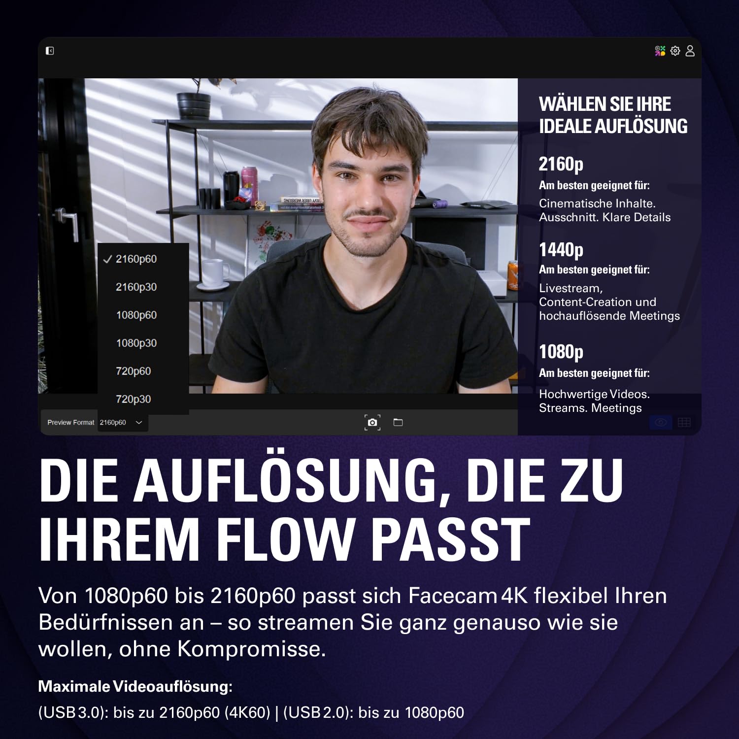 Die Facecam 4K ist das ideale Werkzeug für alle, die Wert auf eine erstklassige visuelle Darstellung legen. Sie eignet sich perfekt für Streaming, die Erstellung von professionellen Videoinhalten und für Videokonferenzen, bei denen höchste Bildqualität und flüssige Bewegungen gefordert sind.