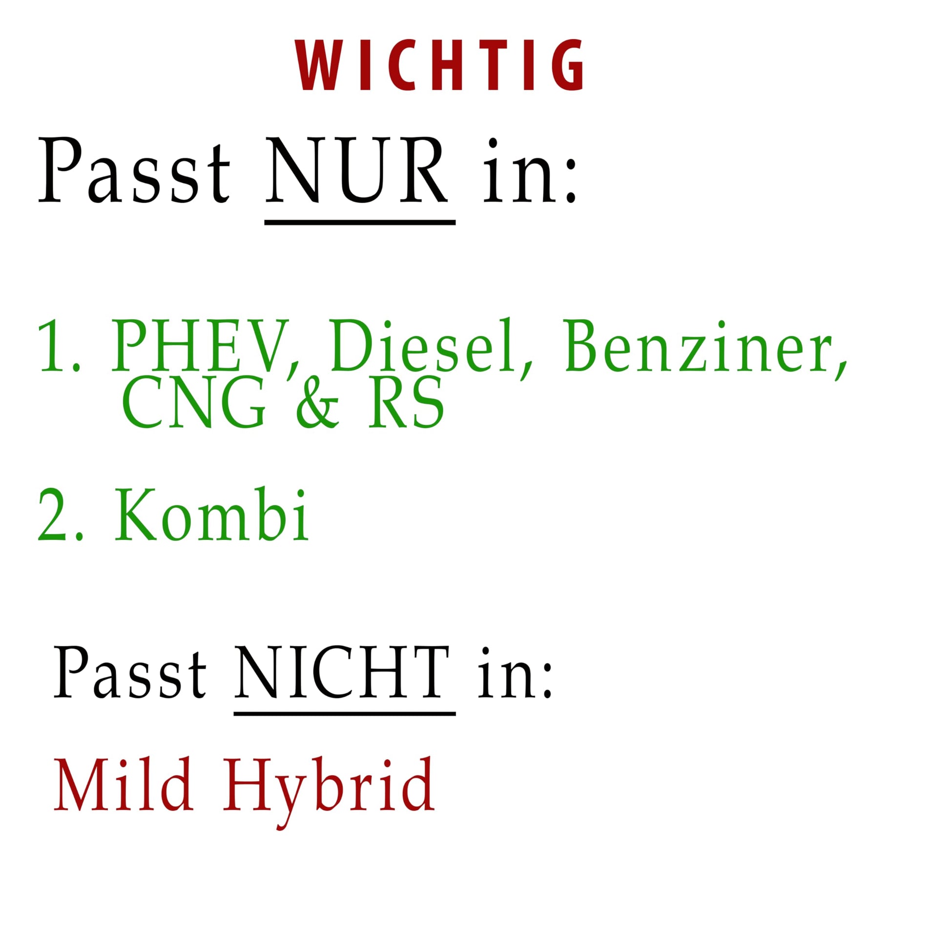 Kompatibilität: Dieses Set ist passend für den Skoda Octavia 4 (NX) Kombi, Baujahre 2020 bis 2025. Es ist nicht für Modelle mit Mild-Hybrid-Antrieb geeignet.