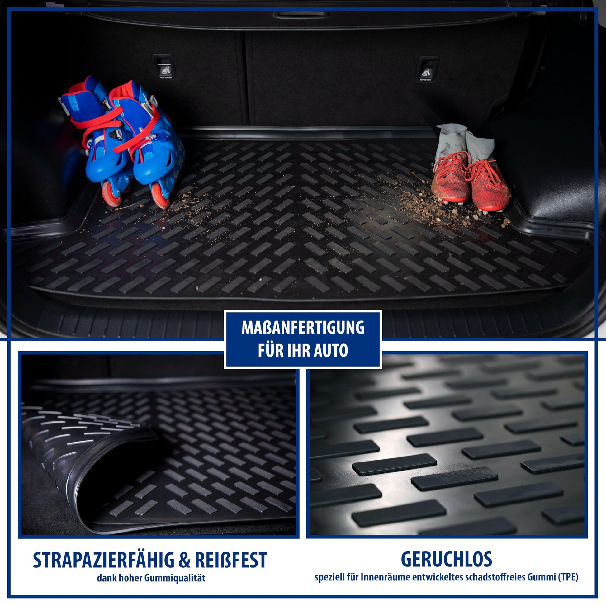 - Rutschhemmende Oberfläche: Die spezielle Textur der Matten sorgt für sicheren Halt Ihrer Füsse und verhindert, dass Ihre Ladung im Kofferraum verrutscht.