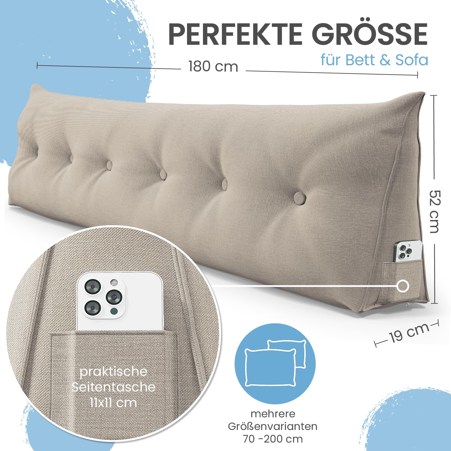 ELONEO Rückenkissen 180 cm breit, Keilkissen für Bett und Sofa geeignet, dreieckiges Lesekissen, Kissen mit abnehmbarem und waschbarem Bezug, mit praktischem Seitenfach