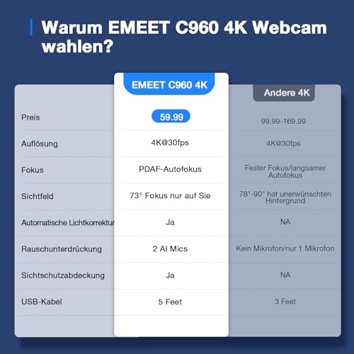 Die EMEET C960 ist somit die perfekte Wahl für alle, die bei virtuellen Meetings keine Kompromisse bei Bild- und Tonqualität eingehen wollen.