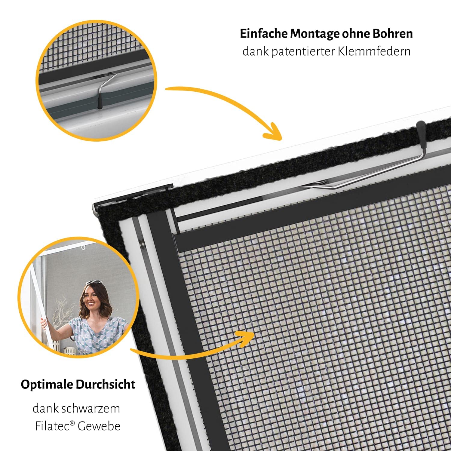Die Montage ist denkbar einfach und kommt ganz ohne Bohren aus. Mithilfe der mitgelieferten Federn wird der Rahmen schonend am Fenster befestigt – eine ideale Lösung für Mietobjekte. Die stabile Konstruktion garantiert dabei eine hohe Widerstandsfähigkeit und eine lange Lebensdauer.