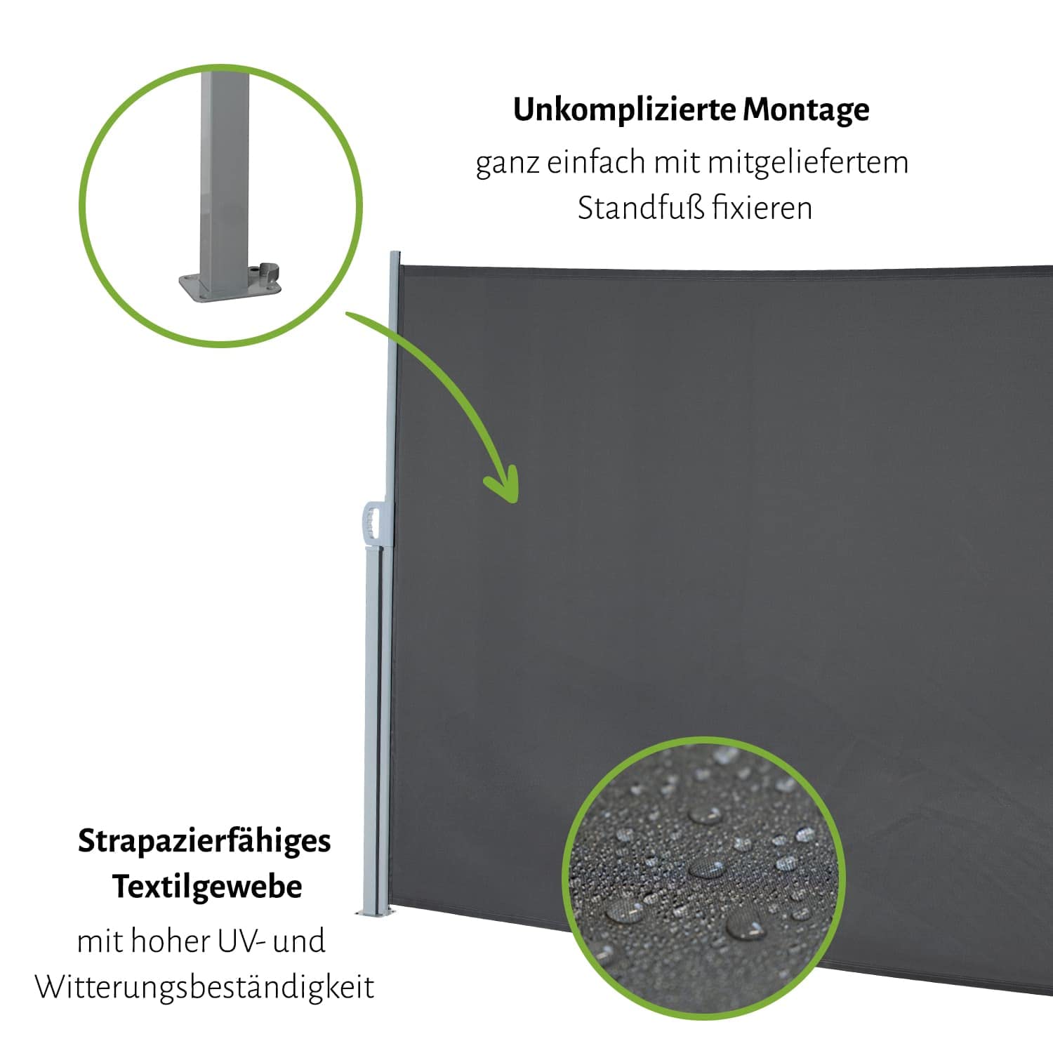 Sie bietet einen multifunktionalen Schutz: als effektiver Sichtschutz vor unerwünschten Blicken, als Abschirmung gegen leichten Wind und als seitlicher Sonnenschutz. So schaffen Sie sich im Handumdrehen einen privaten und komfortablen Rückzugsort.