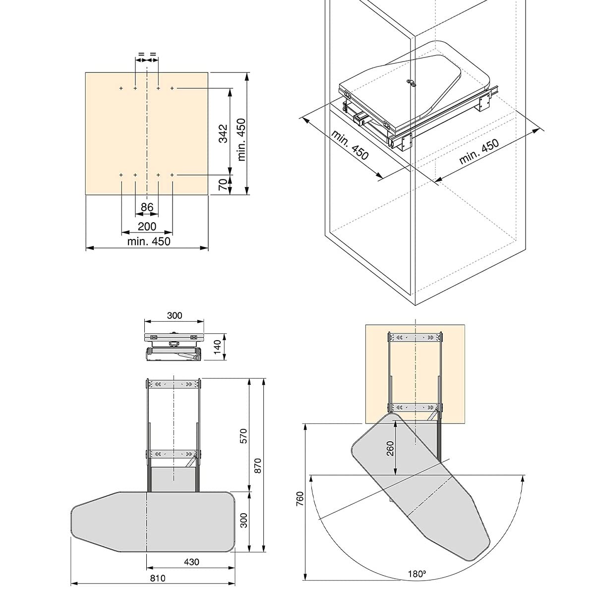 Für die Installation dieses klappbaren Bügelbretts benötigen Sie im Schrankinnern eine Mindestbreite von 450 mm und eine Mindesttiefe von 450 mm.
