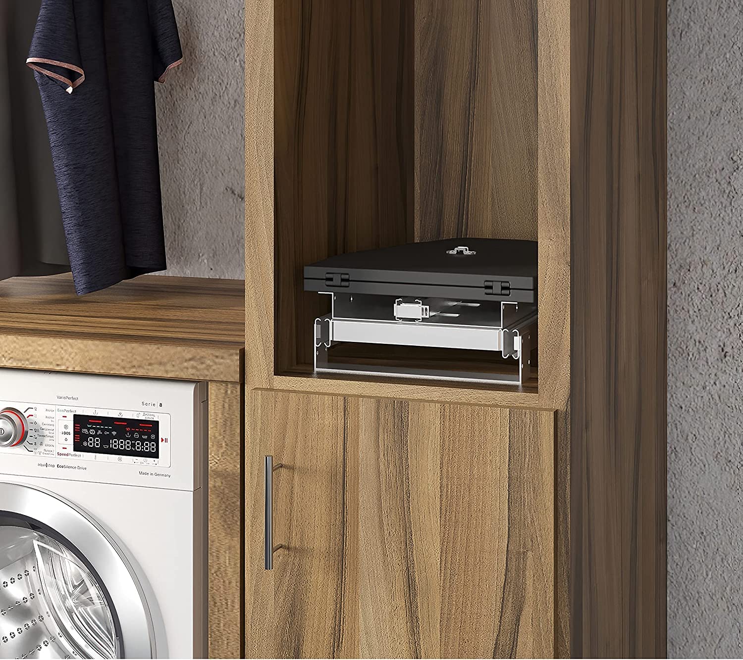 - Ausklappbares Bügelbrett, das sich um 180 Grad drehen lässt und für die Installation auf einem Tablar im Möbel konzipiert ist.