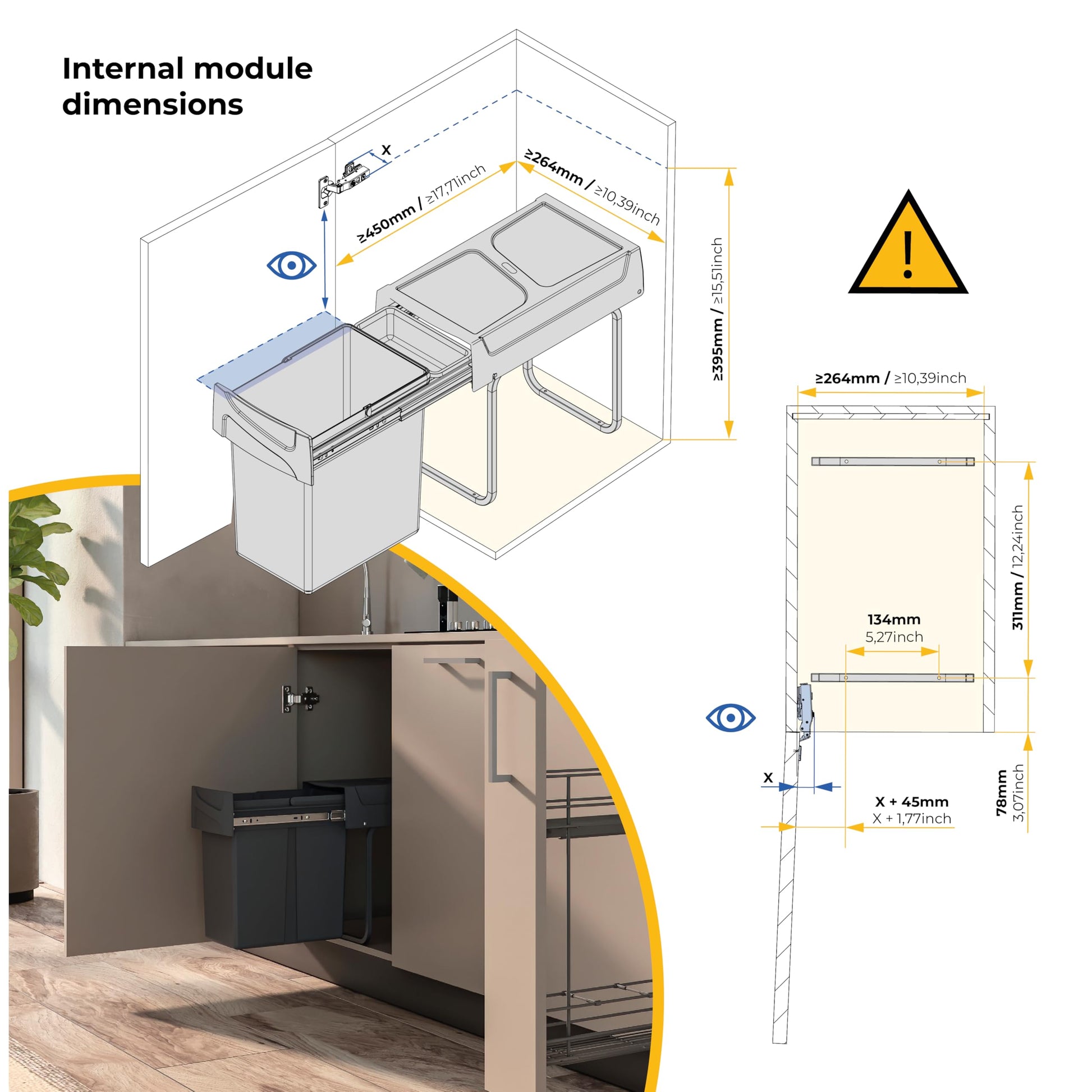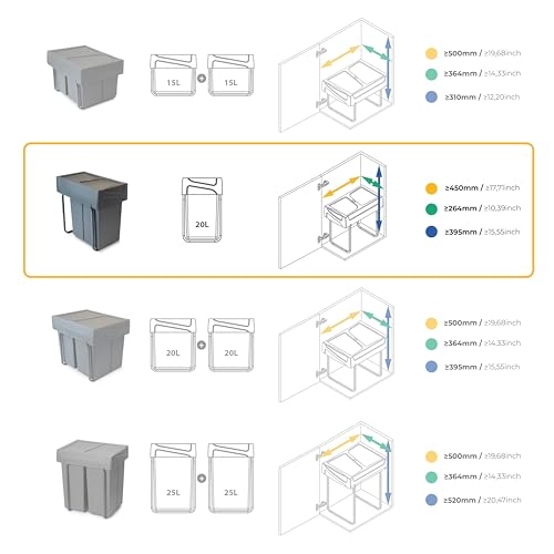 Dieser ausziehbare Abfalleimer ist für Küchenunterschränke mit einem Mindest-Innenmass von 264 mm Breite, 450 mm Tiefe und 395 mm Höhe konzipiert. Er passt somit ideal in gängige Schränke ab 30 cm Aussenbreite.