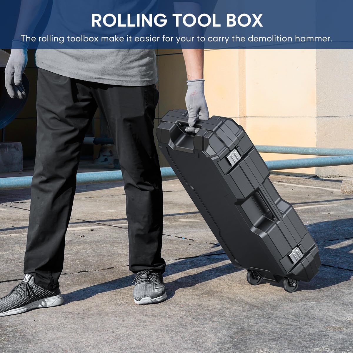 Das Gerät wird als Komplettset geliefert, sodass Sie sofort startklar sind. Enthalten sind der 1700W Abbruchhammer, je ein Spitz- und ein Flachmeissel, ein Paar Ersatz-Kohlebürsten, Schmiermittel, das nötige Werkzeug (Öl- und Sechskantschlüssel) sowie ein robuster Transportkoffer mit Rollen.