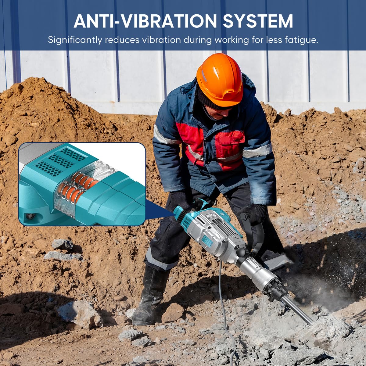 Ja, absolut. Der Abbruchhammer verfügt über ein fortschrittliches Anti-Vibrations-System, das Stösse minimiert und Ihre Gelenke schont. Der um 360° drehbare Zusatzhandgriff und der arretierbare Schalter für den Dauerbetrieb sorgen zusätzlich für hohen Komfort und ermüdungsarmes Arbeiten.