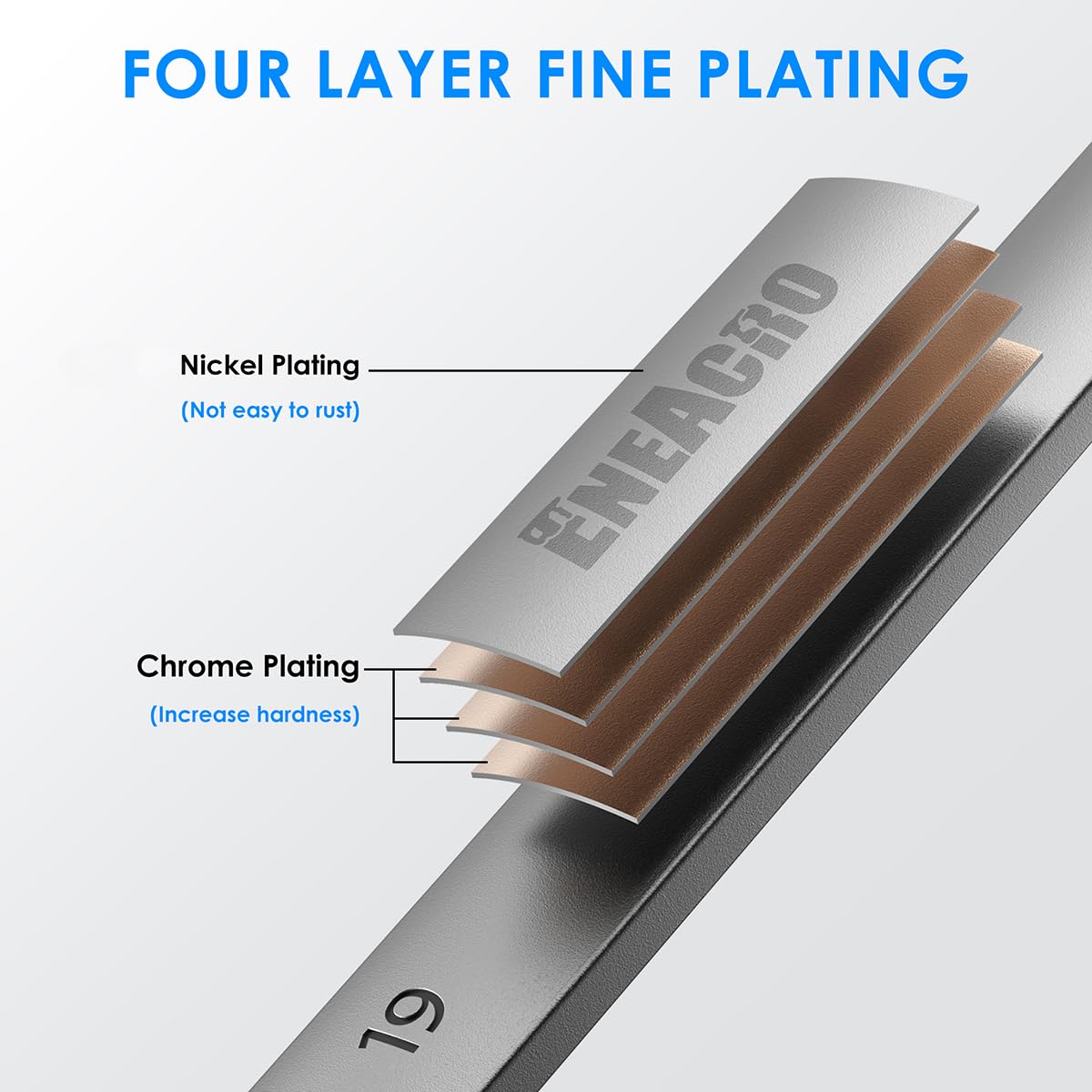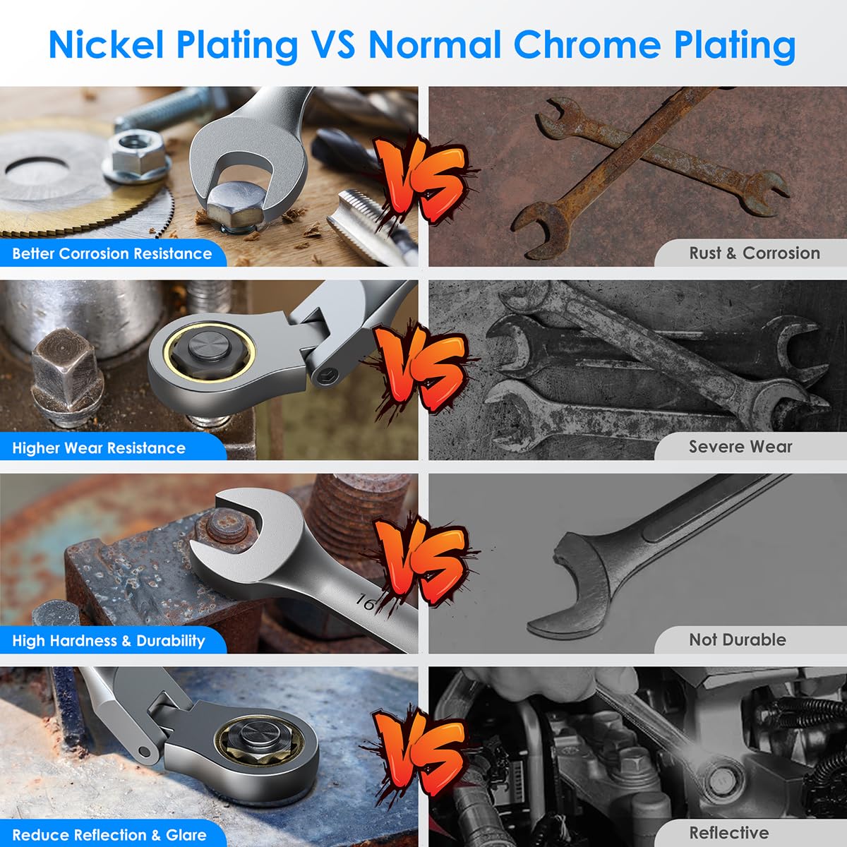 Die Schlüssel sind aus hochfestem Chrom-Vanadium-Stahl (Cr-V) mit einer Härte von bis zu HRC 50 gefertigt. Eine zusätzliche Vernickelung schützt zuverlässig vor Rost und Korrosion, was das Set extrem belastbar und auf eine lange Lebensdauer ausgelegt macht.