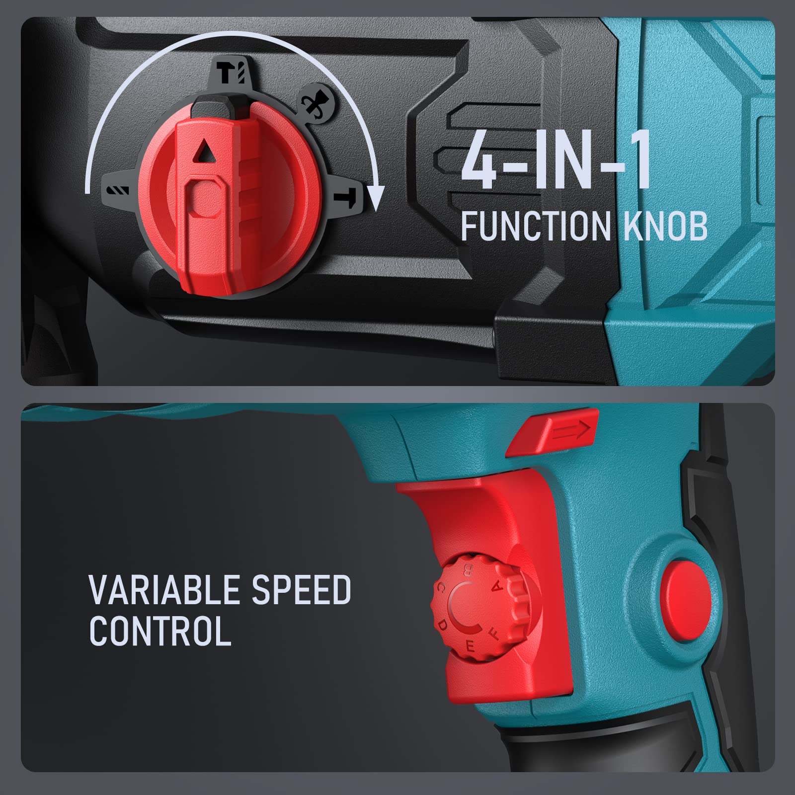 - Vier Betriebsarten: Einfacher Wechsel zwischen Bohren, Hammerbohren, Meisseln und der Meisselpositionsanpassung.