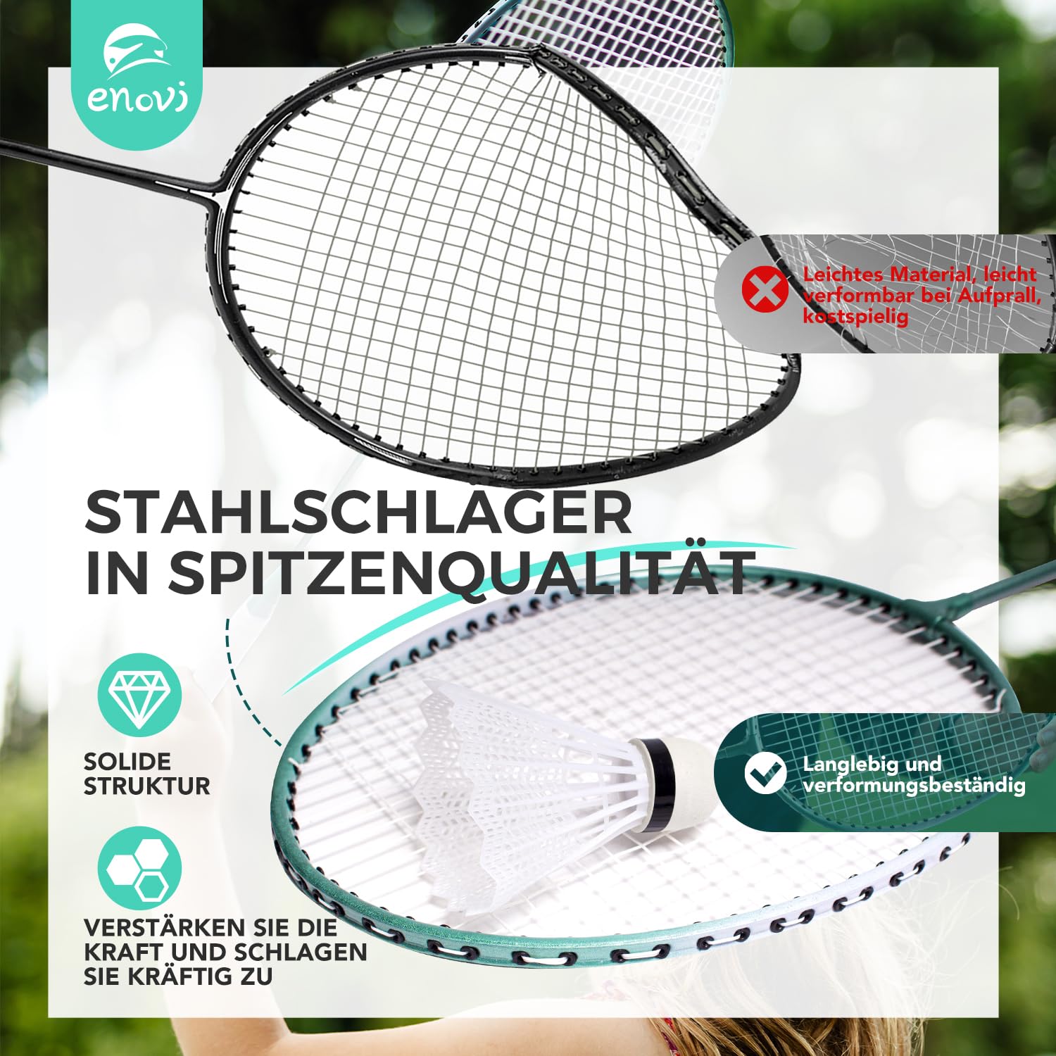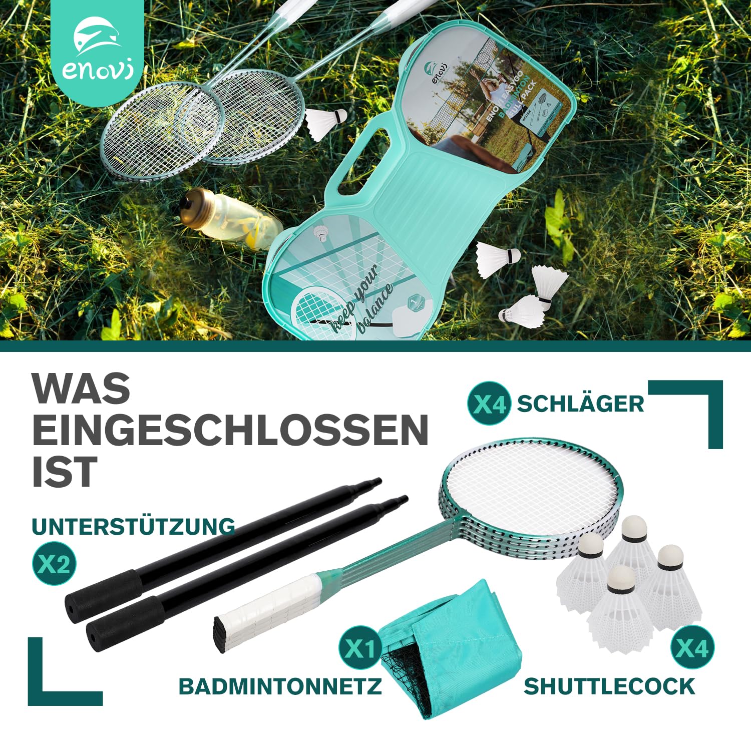 Enovi EasyGo Federball Set – 4 Schläger, Netz und Tragetasche