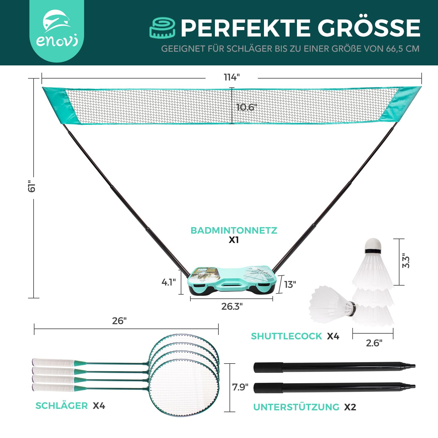 - Set-Inhalt: 1x Transport- und Basisbox, 1x Badmintonnetz, 2x Netzpfosten, 4x Badmintonschläger, 4x Federbälle