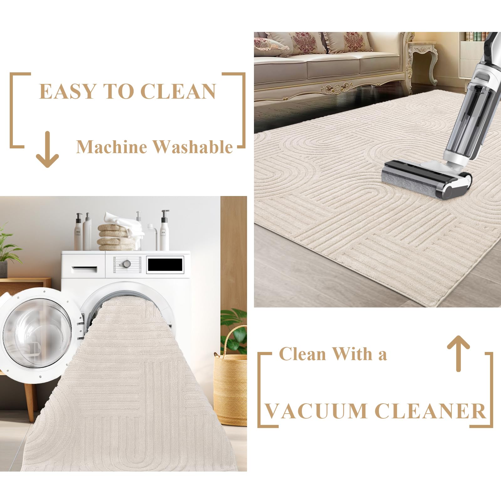 - Unkomplizierte Pflege: Der Teppich ist maschinenwaschbar. Schmutz und Staub lassen sich zudem einfach mit dem Staubsauger oder einem feuchten Tuch entfernen.