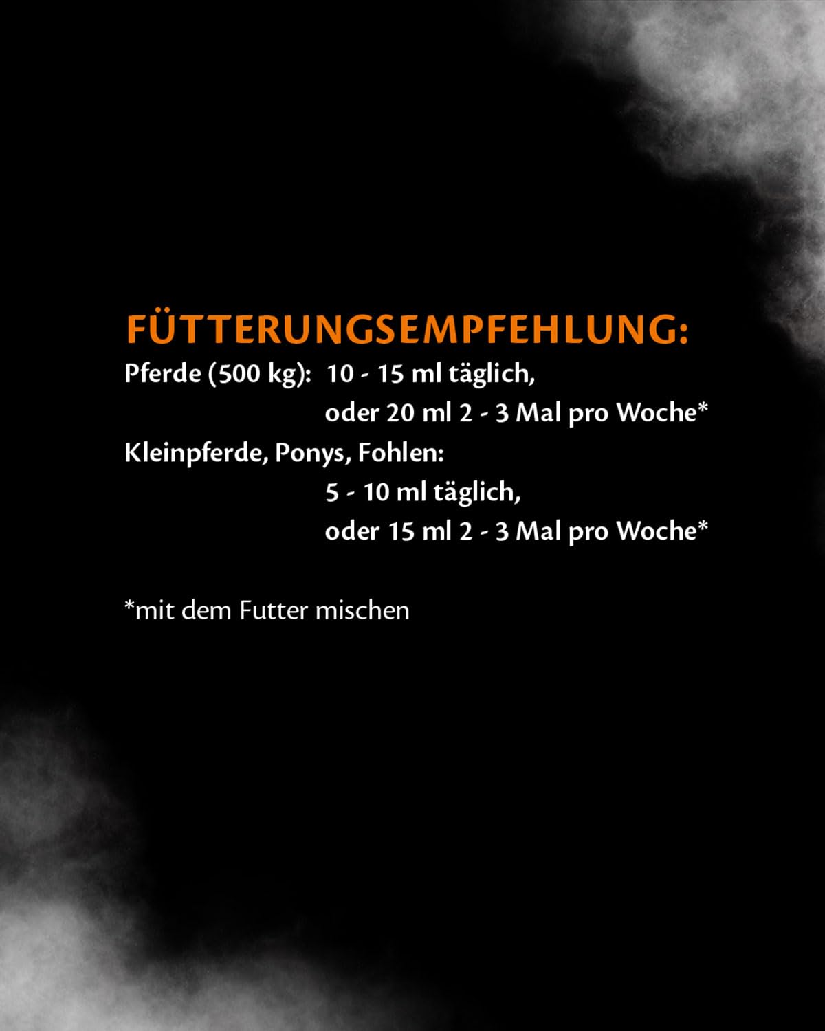 Als flüssiges Ergänzungsfuttermittel lässt es sich einfach über das tägliche Kraftfutter geben oder mit einer Maulspritze direkt verabreichen. Die meisten Pferde nehmen es aufgrund seiner schmackhaften Rezeptur sehr gut an, was eine unkomplizierte und stressfreie Fütterung gewährleistet.