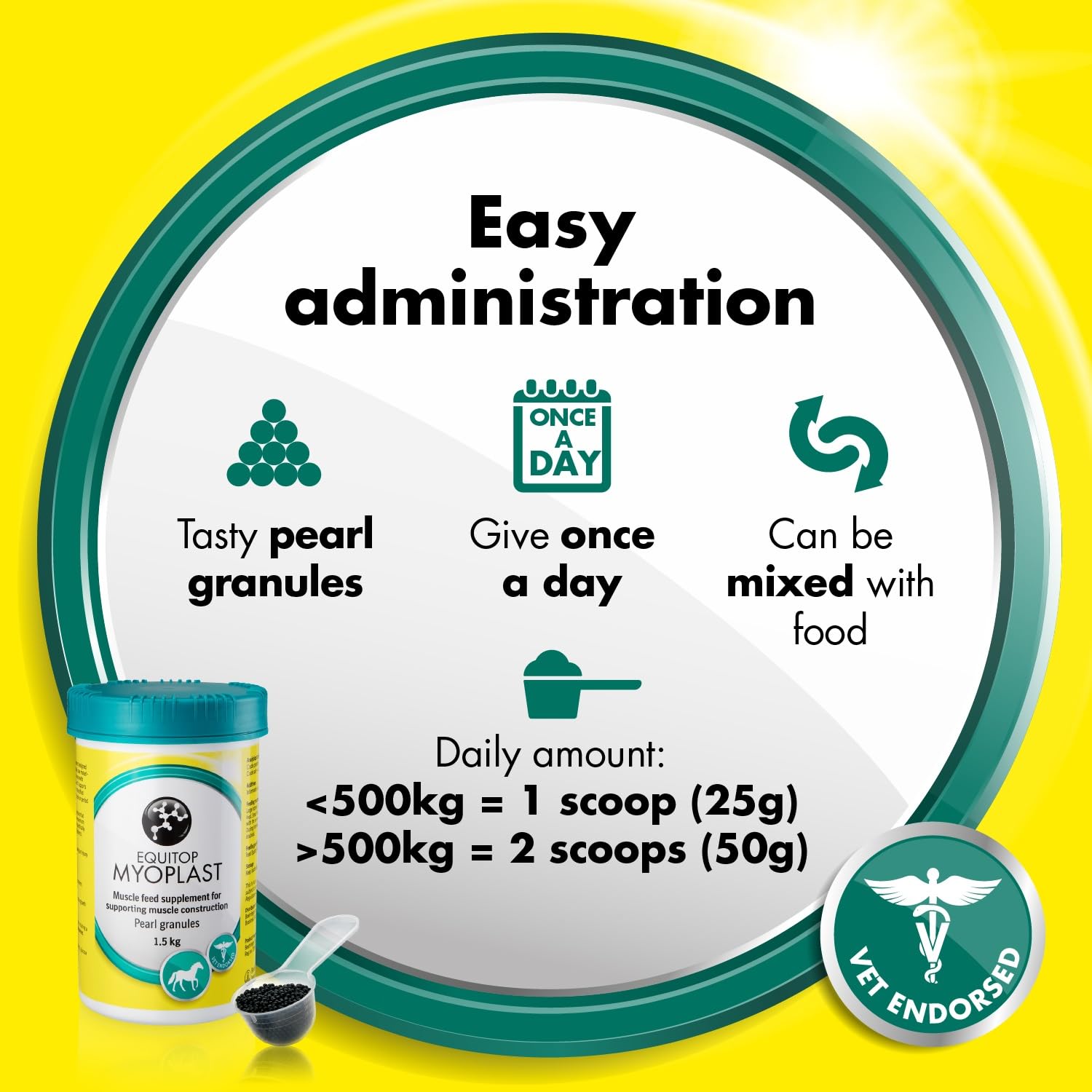 Das schmackhafte Perlgranulat wird einfach unter das tägliche Krippenfutter gemischt. Grosspferde erhalten täglich 50 g (2 Messlöffel), Kleinpferde und Ponys 25 g (1 Messlöffel). Bei sehr intensiver Belastung kann die Dosis verdoppelt werden. Eine Fütterungsdauer von mindestens vier Wochen wird empfohlen.