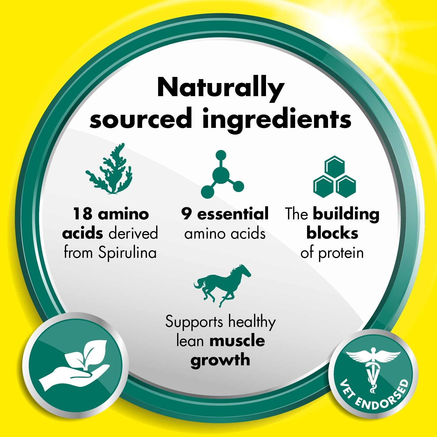 Die spezielle Formel basiert auf einer konzentrierten Mischung von Aminosäuren, die aus der Spirulina-Alge gewonnen werden. Diese unterstützen das Pferd effektiv dabei, die Anforderungen von Training, Wettkampf oder auch Phasen der Rehabilitation besser zu bewältigen.