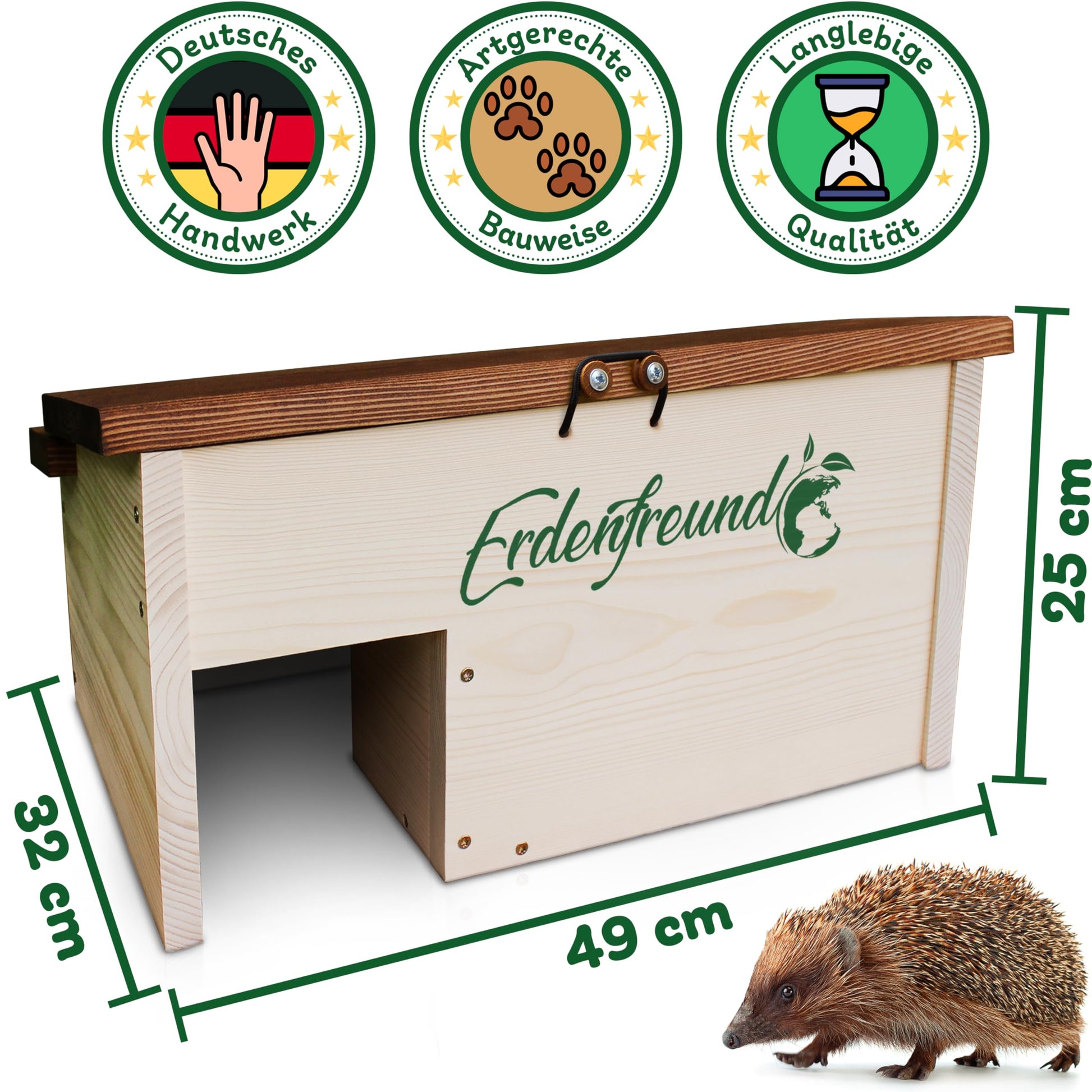 - Artgerechtes Design: Die bewusste bodenlose Konstruktion ermöglicht es den Igeln, ihre natürliche Schlafmulde direkt auf dem Erdboden zu graben.