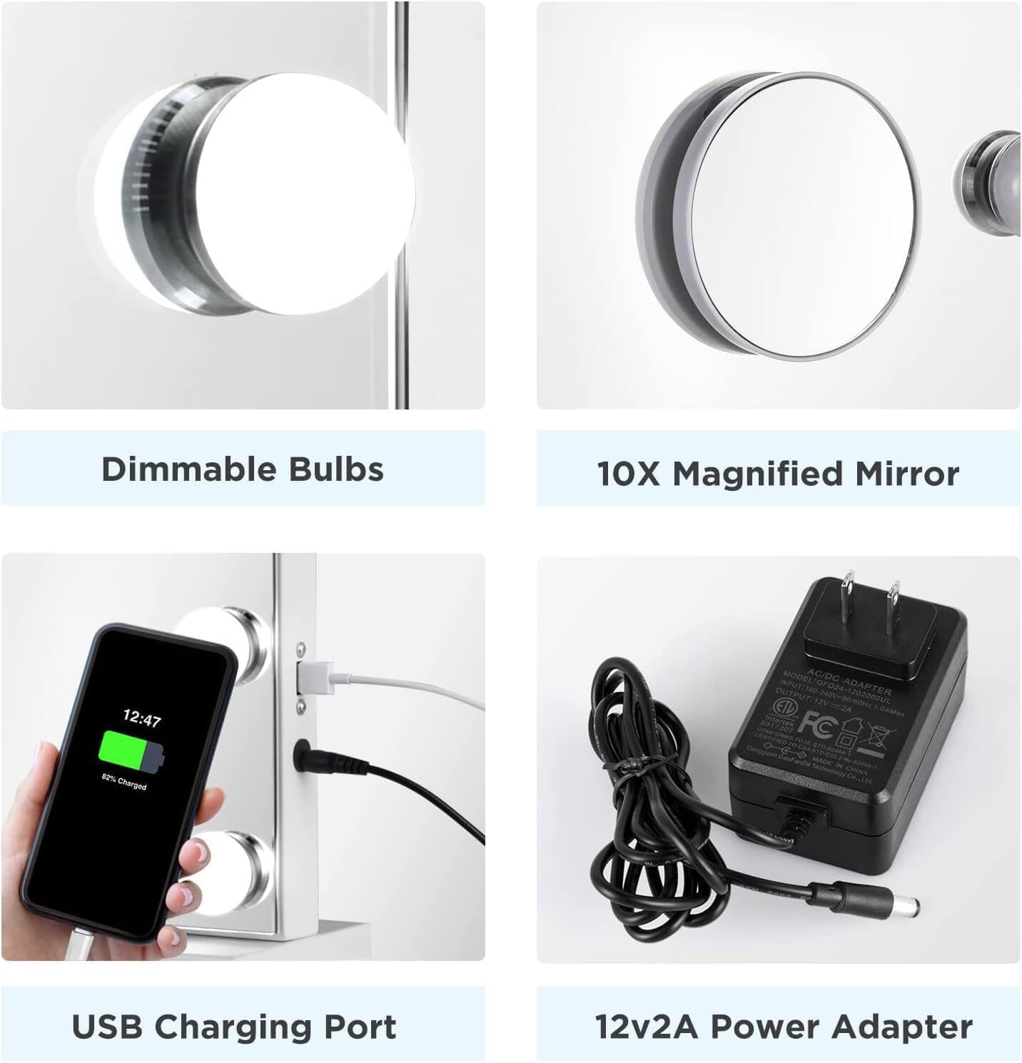 - Integrierte Ladeanschlüsse: An der Seite des Spiegels befinden sich ein USB- und ein Type-C-Anschluss, damit Sie Ihr Smartphone oder andere Geräte bequem während des Schminkens aufladen können.