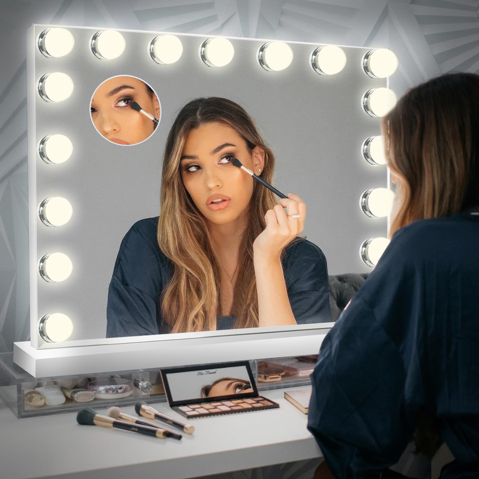 Verwandeln Sie Ihren Schminkplatz in eine professionelle Beauty-Lounge. Dieser grosszügig dimensionierte Spiegel im Hollywood-Stil sorgt mit seiner integrierten Beleuchtung für optimale Lichtverhältnisse bei jedem Make-up, egal zu welcher Tageszeit.