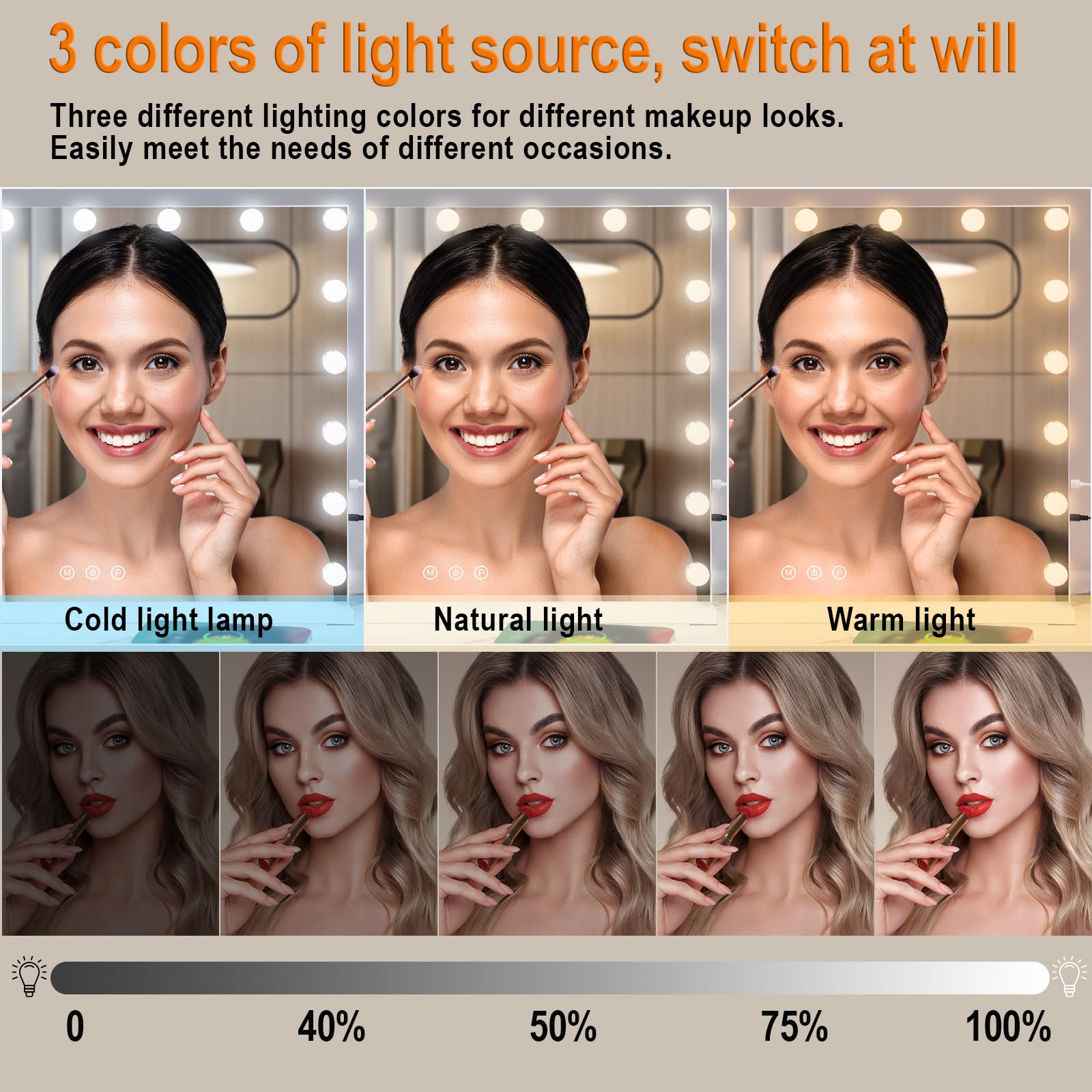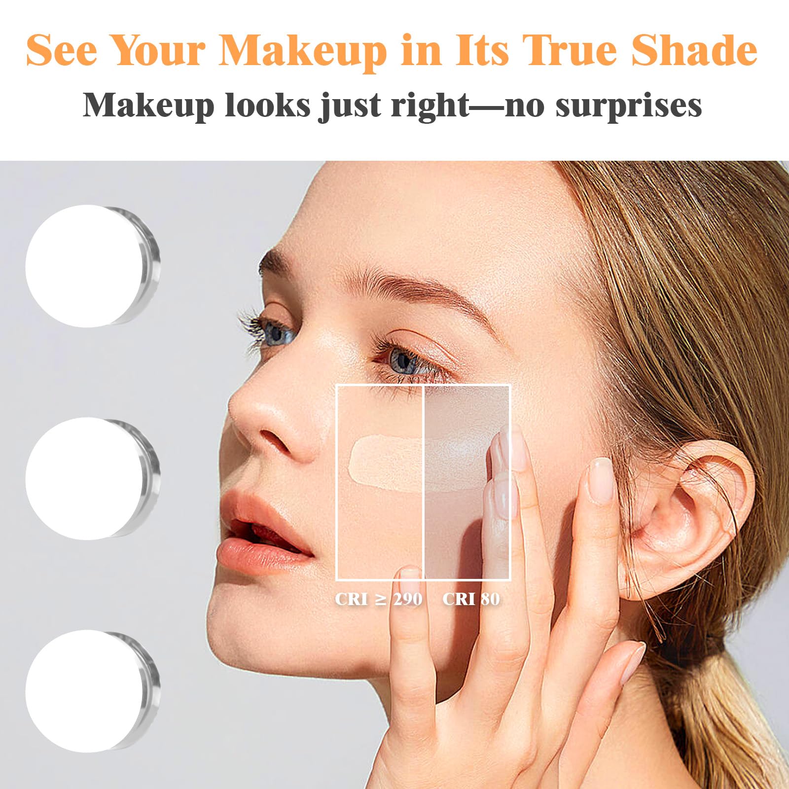 Das anpassbare Licht sorgt dafür, dass Ihr Make-up bei jeder Tages- und Nachtzeit makellos und natürlich wirkt. Ob Sie sich für ein Meeting am Tag oder ein Abendessen vorbereiten, die Beleuchtung simuliert die jeweiligen Umgebungsbedingungen und verhindert unschöne Make-up-Ränder oder falsche Farbtöne.