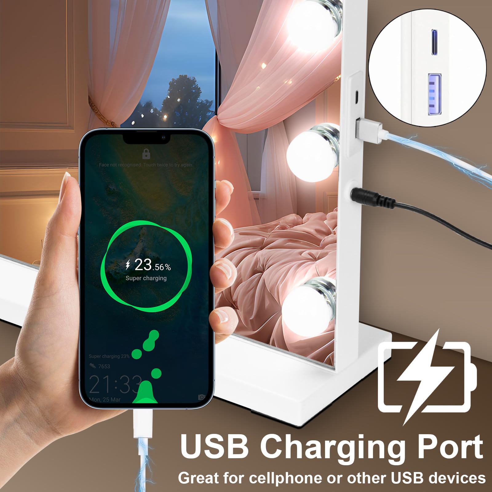 Neben der vielseitigen Beleuchtung verfügt der Spiegel an der Seite über einen USB- und einen Type-C-Anschluss. So können Sie Ihr Smartphone oder andere Geräte bequem aufladen, während Sie sich schminken, was Ihre tägliche Routine noch effizienter macht.