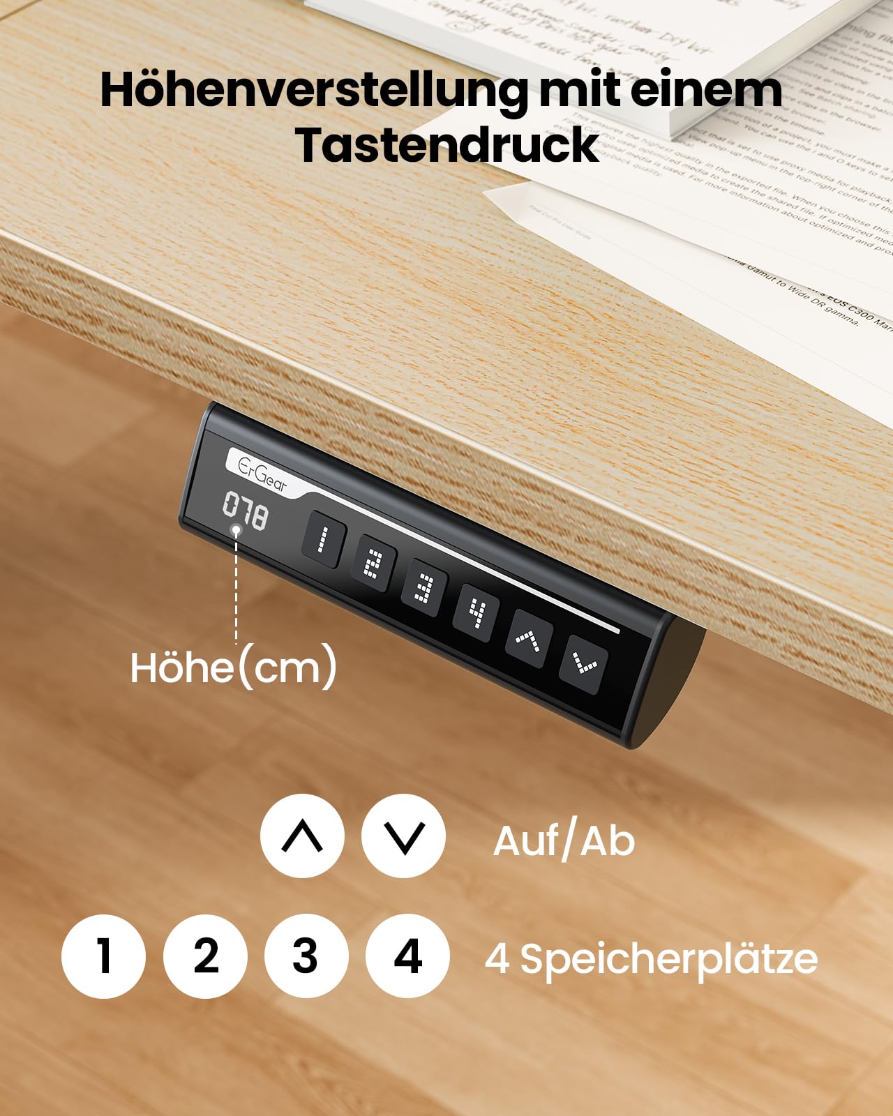 - Intelligente Steuerung: Ein LED-Bedienfeld ermöglicht die einfache Steuerung und das Speichern von vier individuellen Höheneinstellungen in der Memory-Funktion.