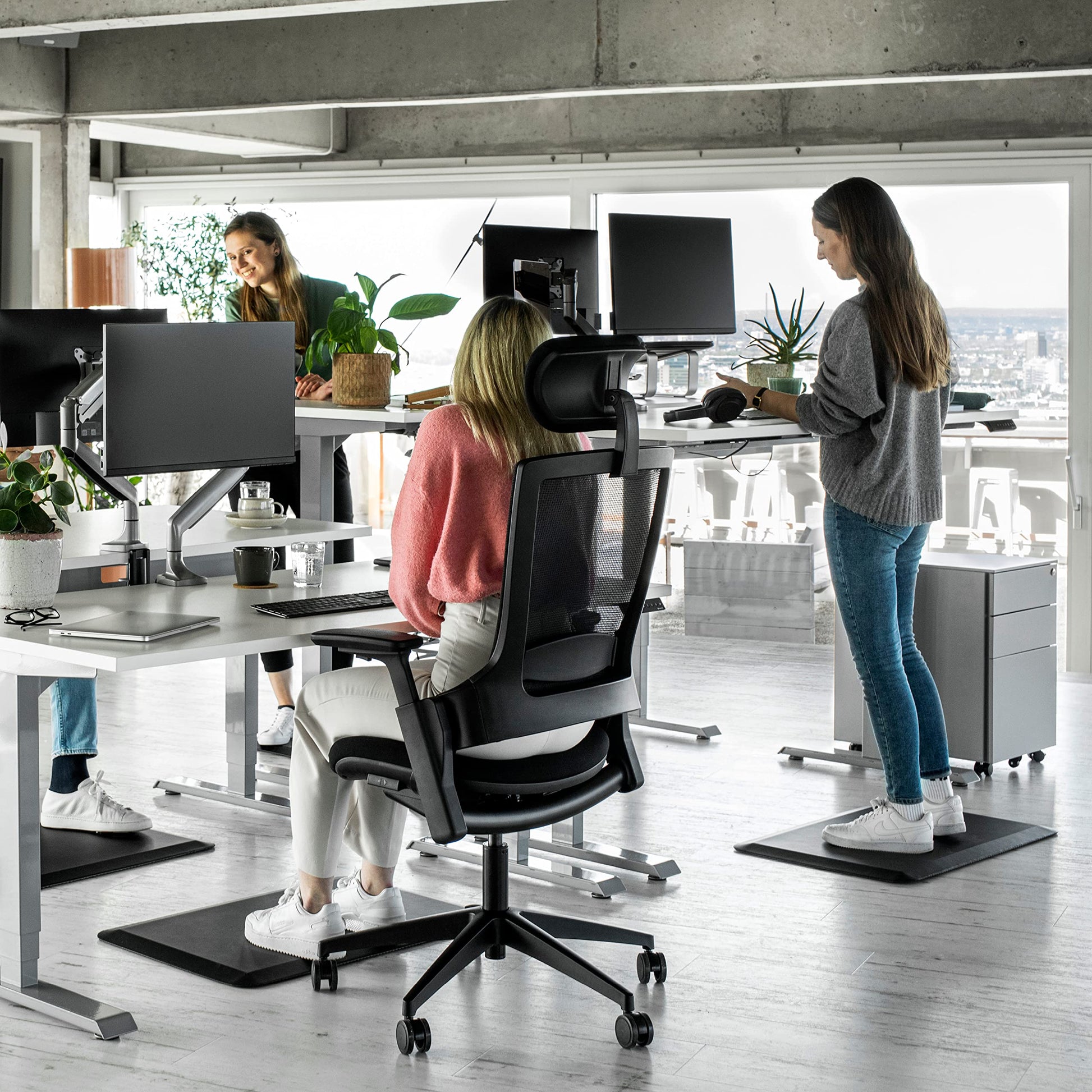 Die Matte entlastet durch ihre federnden Eigenschaften aus Polyurethan-Schaum spürbar Gelenke, Füsse und Rücken. Sie fördert eine dynamische Körperhaltung, was Muskelverspannungen reduziert, die Tiefenmuskulatur stärkt und schweren Beinen effektiv vorbeugt. So bleiben Sie länger schmerzfrei und konzentriert.