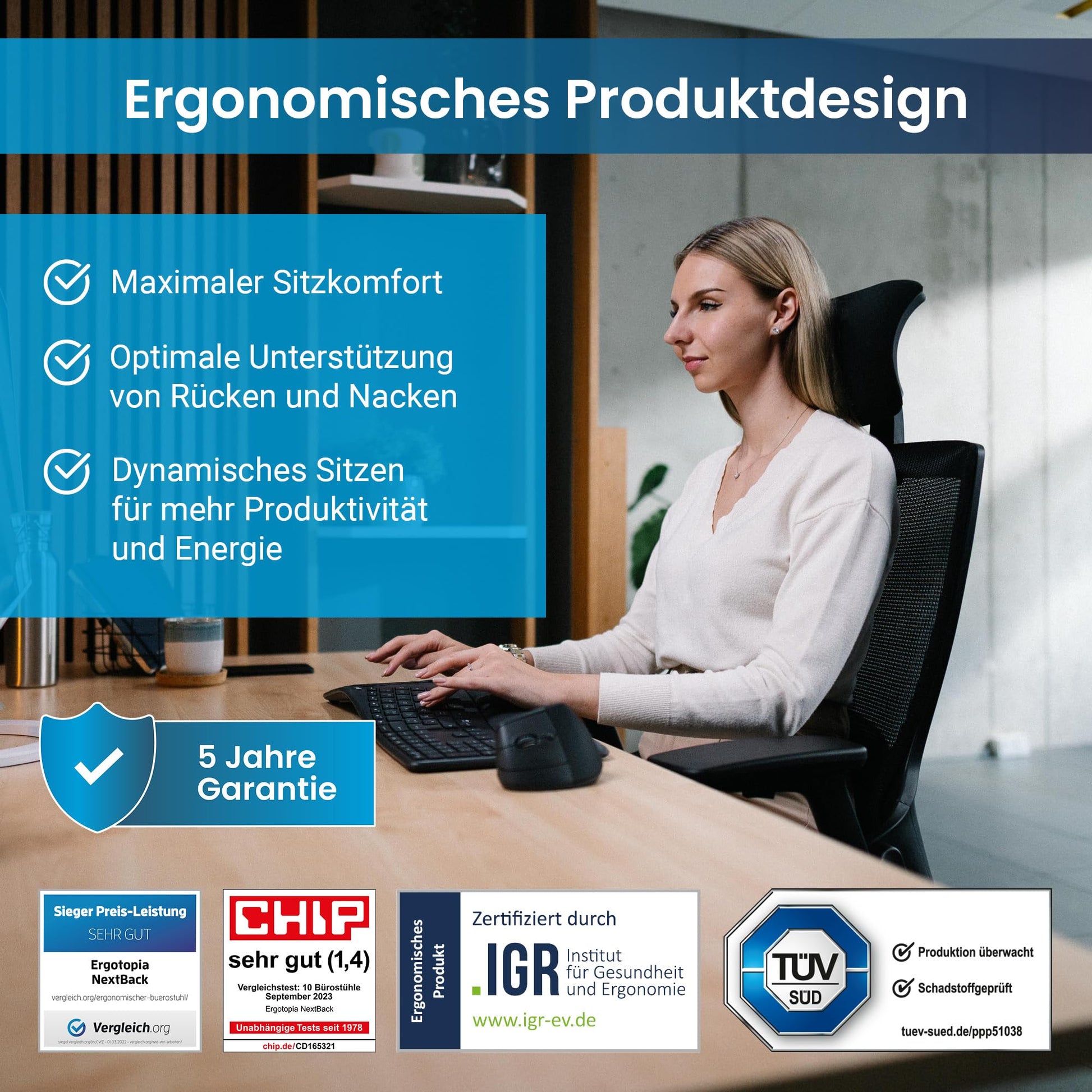 Ergotopia bietet eine umfassende Herstellergarantie von 5 Jahren auf den NextBack Bürostuhl. Dies unterstreicht die hohe Qualität der Materialien sowie der Verarbeitung und sichert Ihre Investition in die Gesundheit und das Wohlbefinden an Ihrem Arbeitsplatz langfristig ab.