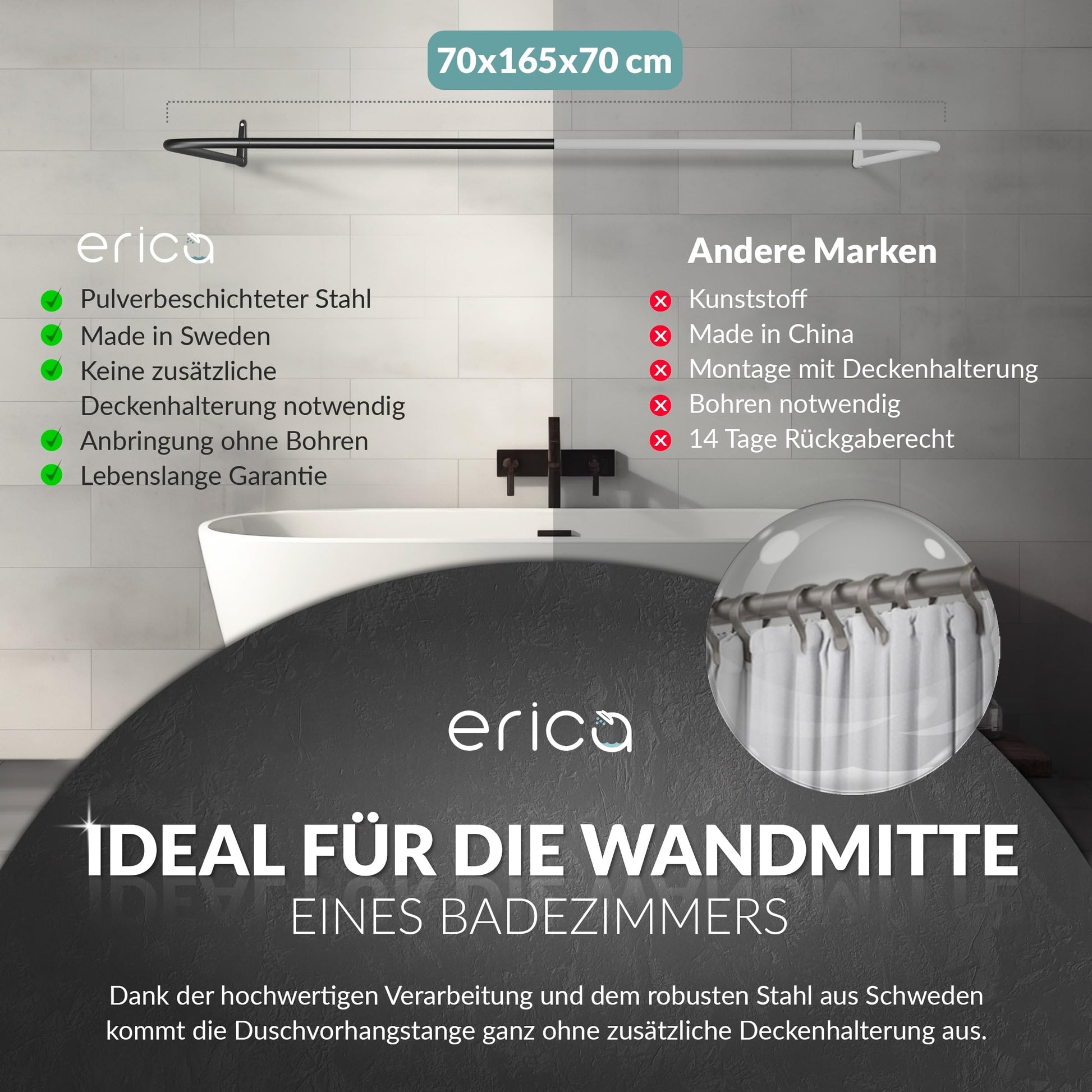 Um die hohe Qualität und Langlebigkeit zu unterstreichen, wird auf das Erica Duschvorhangstangensystem eine lebenslange Garantie gewährt. Sie investieren damit in eine sichere und dauerhafte Lösung für Ihr Badezimmer.