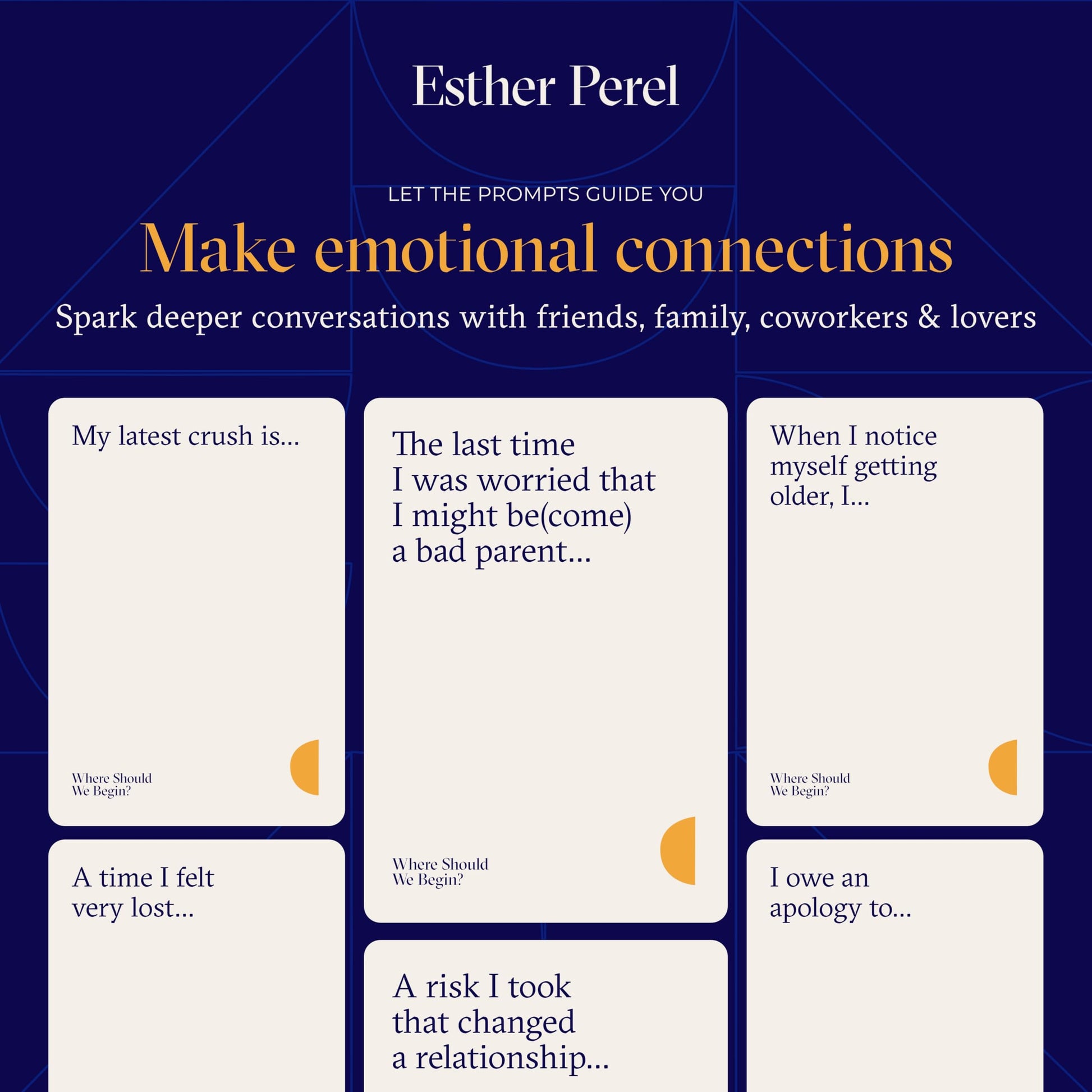 Entdecken Sie eine neue Ebene der Verbundenheit mit diesem einzigartigen Kartenspiel, das von der weltbekannten Beziehungsexpertin Esther Perel konzipiert wurde, um bedeutungsvolle Gespräche anzustossen.