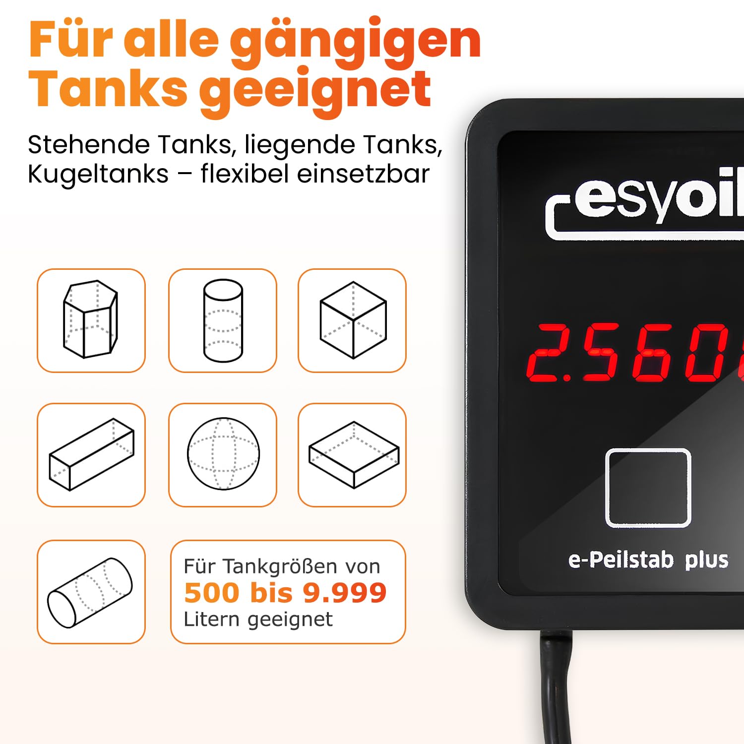 Der e-Peilstab ist universell für alle gängigen stehenden und zylindrischen Heizöltanks mit einem Fassungsvermögen von 500 bis 9.999 Litern konzipiert. Er eignet sich ideal für oberirdische Kellertanks oder Batterietanks aus Kunststoff oder Stahl.