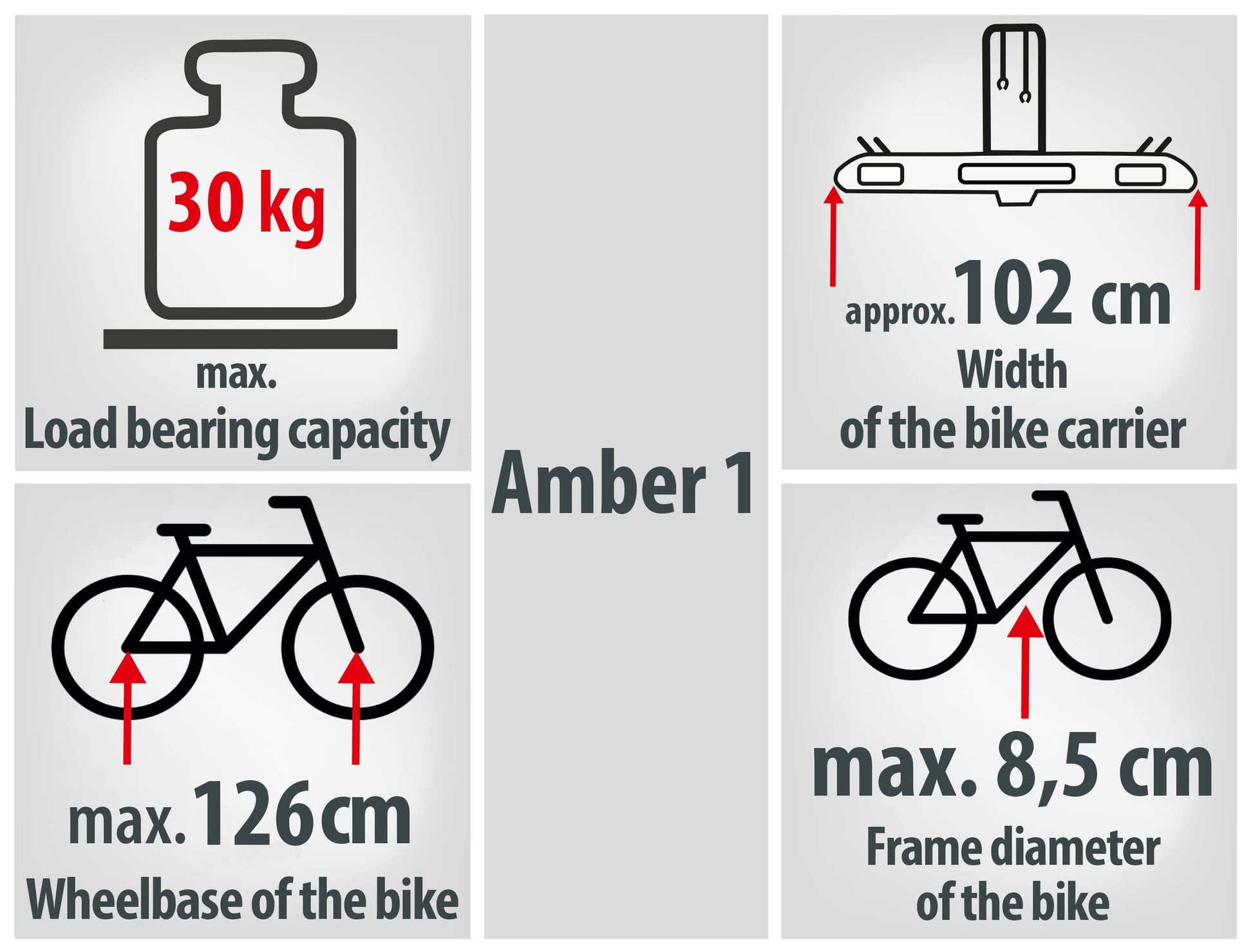 Der Träger ist für den sicheren Transport eines einzelnen Fahrrads konzipiert. Er eignet sich hervorragend für schwere E-Bikes mit einem Gewicht von bis zu 30 kg und passt für die meisten Rahmenarten (inkl. Oversize- und Y-Rahmen bis 8,5 cm) sowie für Reifen bis zu 2,2 Zoll Breite.