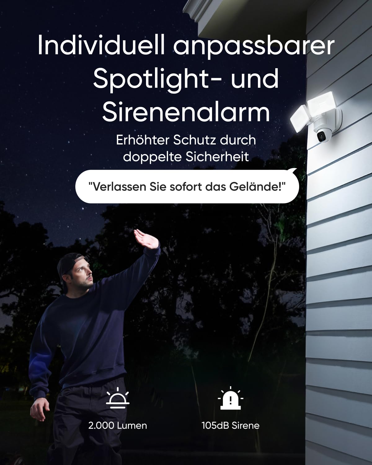 Die hohe 2K-Auflösung liefert kristallklare Bilder, auf denen Personen und Details deutlich erkennbar sind. Die extrem hellen, bewegungsaktivierten Flutlichter sorgen nicht nur für eine klare Nachtsicht in Farbe, sondern wirken auch als effektive Abschreckung für unerwünschte Besucher.
