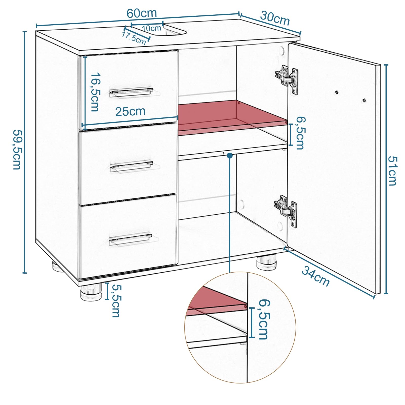 Die Gesamtmasse des Schranks beträgt 60 x 59,5 x 30 cm (Breite x Höhe x Tiefe). Er verfügt über einen Siphonausschnitt von 17,5 x 10 cm (Tiefe x Breite). Um eine perfekte Passform zu gewährleisten, empfehlen wir dringend, vor dem Kauf den verfügbaren Platz und die Masse Ihres Siphons auszumessen.