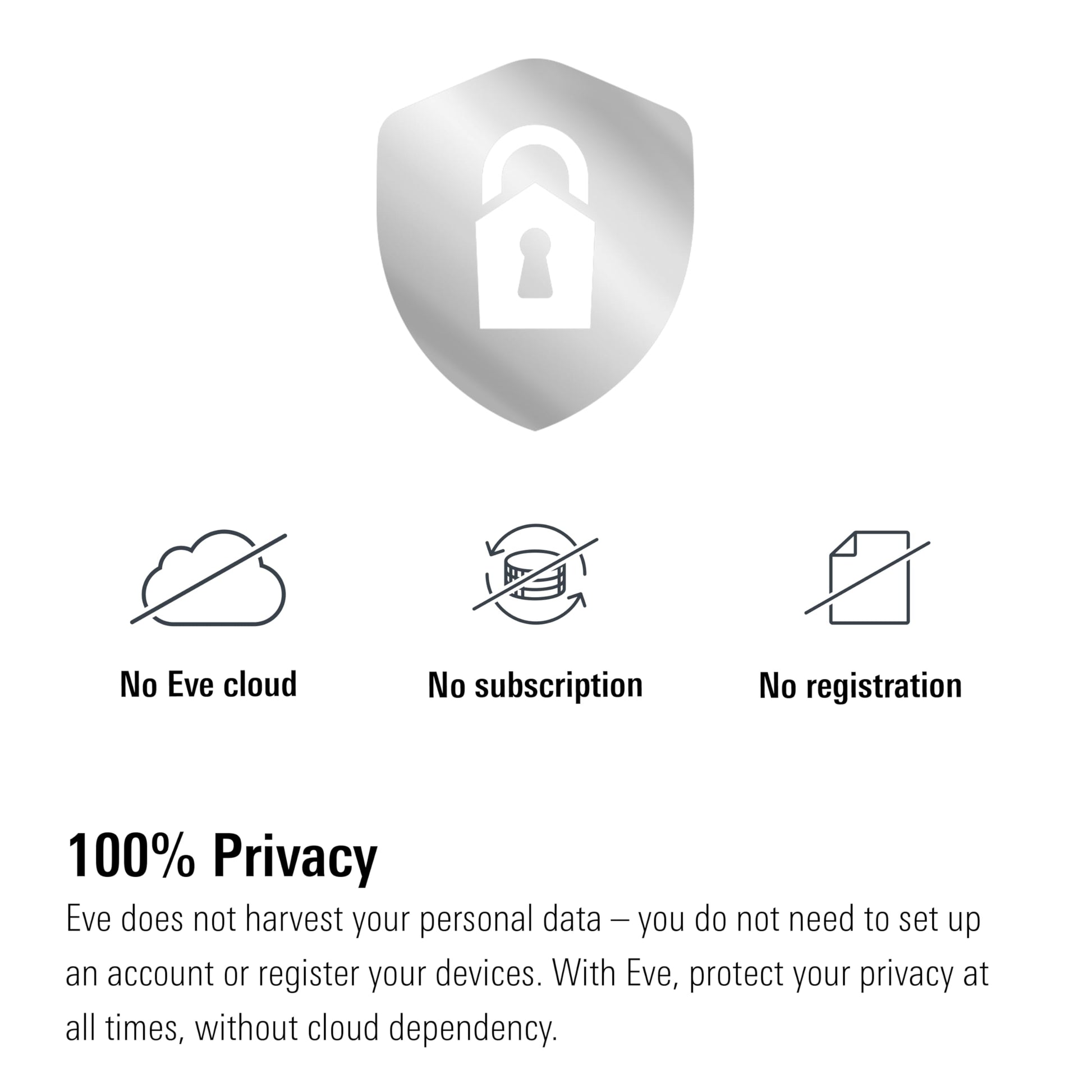- Maximaler Datenschutz: Ihr Zuhause bleibt privat. Der Betrieb erfolgt ohne Eve-Cloud, ohne Registrierung und ohne jegliches Tracking durch rein lokale Prozesse.