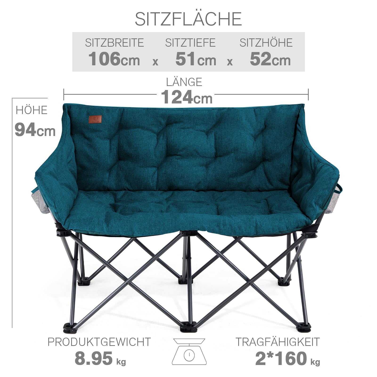 Das Campingsofa ist äusserst robust und für ein Gesamtgewicht von bis zu 320 kg ausgelegt, was einer Belastung von 160 kg pro Sitzplatz entspricht. Die stabile Stahlrohrkonstruktion sorgt für maximale Sicherheit und Langlebigkeit.